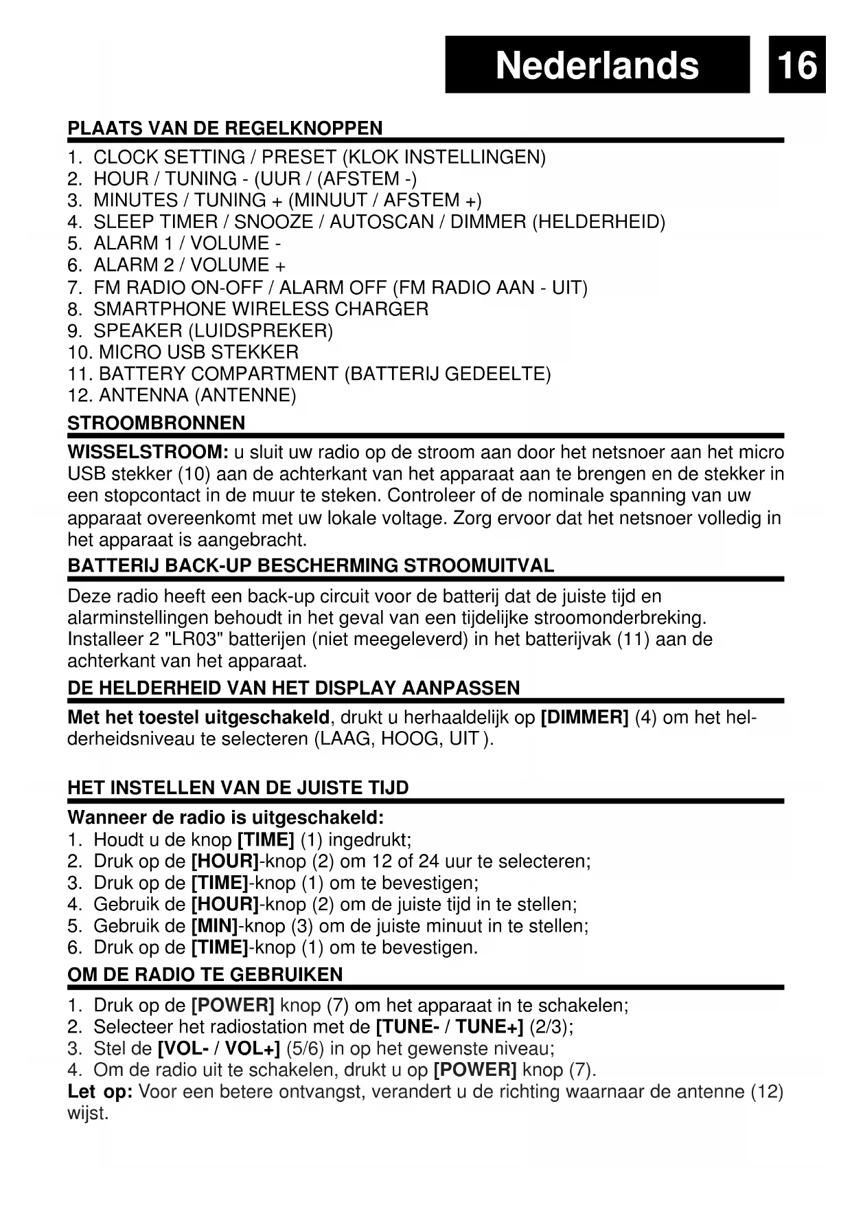 Verwijder de beschermende cover als deze van metaal is of dikker dan 3mm Opmerking: werkt met de meeste Polycarbonate (PC), thermoplastische polyure- thaan (TPU) en gecertificeerde QI Wireless Charging compatibele beschermingsco- vers. TECHNISCHE SPECIFICATIES Stroomvoorziening: AC 100-240V~ 50/60Hz (AC/DC 5V= 2A adapter). Dekking van radiofrequentie FM: 87.5 - 108 MHz. Luidspreker Uitgangsvermogen: 1 x 0.5 Watt RMS. Algemeen Wireless Charger Power: 5 Watt. Kenmerken zijn zonder voorafgaande kennisgeving onderhevig aan veranderingen. Dit symbool dat staat weergegeven op het product en in de documentatie ervan, duidt erop dat het product niet kan worden weggegooid met het gewone huisvuil aan het einde van de levensduur. Om schade aan het milieu of aan de gezondheid door ongepaste afvalverwijdering te voorkomen, dient de gebruiker dit product te schei-den van andere soorten afval op verantwoorde wijze ter bevordering van duurzaam hergebruik van de materië-le hulpbronnen. De thuisgebruiker dient contact op te nemen met de verkoper van het apparaat of met de loka-le gemeente voor informatie met betrekking tot het scheiden en recyclen van dit type product. Zakelijke gebrui-kers dienen contact op te nemen met hun leverancier en de algemene voorwaarden van de verkoopovereen-komst te raadplegen. Dit product dient niet te worden gemengd met ander bedrijfsafval voor de verwijdering.