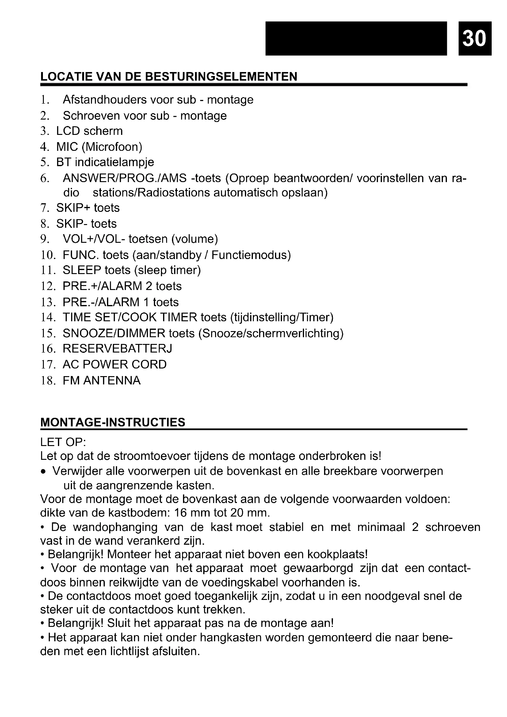 Afstandhouders voor sub - montage Schroeven voor sub - montage LCD scherm MIC (Microfoon) BT indicatielampje ANSWER/PROG./AMS -toets (Oproep beantwoorden/ voorinstellen van ra- dio stations/Radiostations automatisch opslaan) SKIP+ toets SKIP- toets VOL+/VOL- toetsen (volume) FUNC. toets (aan/standby / Functiemodus) SLEEP toets (sleep timer) PRE.+/ALARM 2 toets PRE.-/ALARM 1 toets TIME SET/COOK TIMER toets (tijdinstelling/Timer) SNOOZE/DIMMER toets (Snooze/schermverlichting) RESERVEBATTERJ