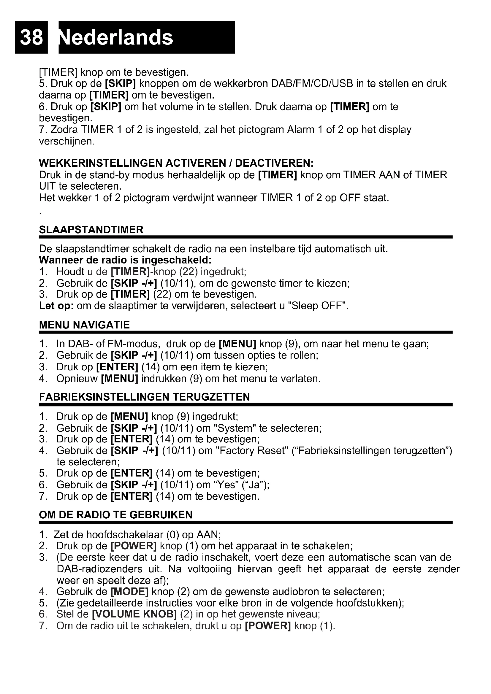- Random: Nummers worden willekeurig afgespeeld. EQUALIZER In elke modus kunt u de Equalizer gebruiken. Houd de [EQ] -knop (20) even ingedrukt, dan druk er weer herhaaldelijk kort op om tussen te verschillende presets te kiezen: FLAT / POP / CLASSIC / ROCK / JAZZ.42 Nederlands TECHNISCHE SPECIFICATIES Stroomvoorziening: AC 230V ~ 50Hz. Stroomverbruik in stand-by: 0.33W Stand-by tijd 15 min Dekking van radiofrequentie DAB+/DAB: BAND III 174.928 - 239.200 MHz. FM: 87.5 - 108 MHz. Luidspreker Uitgangsvermogen: 2 x 15 Watt RMS. Algemeen Aux-In: RCA (L+R) plug. Koptelefoon-Uitgang: 3.5mm jack plug. Maximaal uitgestraald vermogen: < 4dBm (2.5 mW) (Bluetooth). USB-Aansluiting Versie: USB 2.0. Kenmerken zijn zonder voorafgaande kennisgeving onderhevig aan veranderingen. Dit symbool dat staat weergegeven op het product en in de documentatie ervan, duidt erop dat het pro-duct niet kan worden weggegooid met het gewone huisvuil aan het einde van de levensduur. Om schade aan het milieu of aan de gezondheid door ongepaste afvalverwijdering te voorkomen, dient de gebruiker dit product te scheiden van andere soorten afval op verantwoorde wijze ter bevordering van duurzaam hergebruik van de materiële hulpbronnen. De thuisgebruiker dient contact op te nemen met de verkoper van het apparaat of met de lokale gemeente voor informatie met betrekking tot het scheiden en recyclen van dit type product. Zakelijke gebruikers dienen contact op te nemen met hun leverancier en de algeme-ne voorwaarden van de verkoopovereenkomst te raadplegen. Dit product dient niet te worden gemengd met ander bedrijfsafval voor de verwijdering.