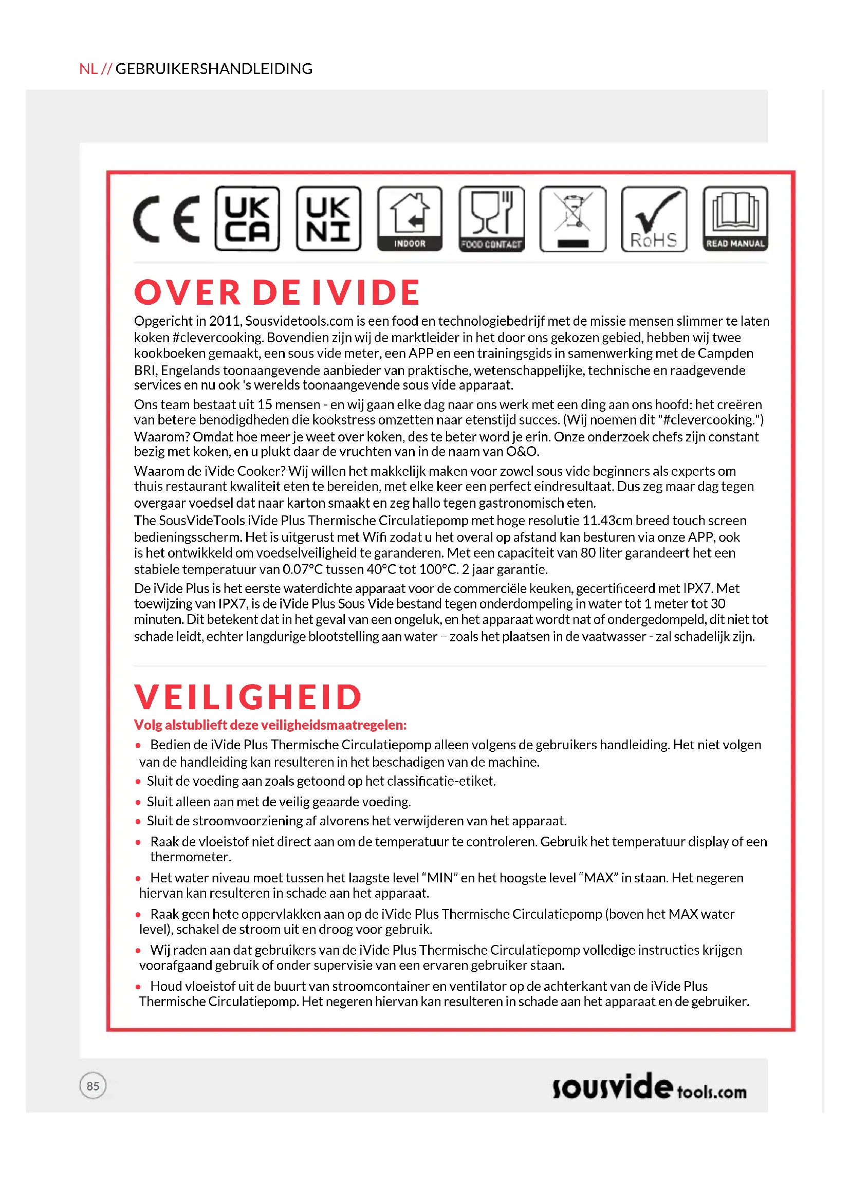 VEILIGHEID Opgericht in 2011, Sousvidetools.com is een food en technologiebedrijf met de missie mensen slimmer te laten koken #clevercooking.Bovendien zijn wij de marktleider in het door ons gekozen gebied, hebben wij twee kookboeken gemaakt, een sous vide meter, een APP en een trainingsgids in samenwerking met de Campden BRI, Engelands toonaangevende aanbieder van praktische, wetenschappelijke, technische en raadgevende services en nu ook 's werelds toonaangevende sous vide apparaat. Ons team bestaat uit 15 mensen - en wij gaan elke dag naar ons werk met een ding aan ons hoofd: het creëren van betere benodigdheden die kookstress omzetten naar etenstijd succes. (Wij noemen dit "#clevercooking.") Waarom? Omdat hoe meer je weet over koken, des te beter word je erin. Onze onderzoek chefs zijn constant bezig met koken, en u plukt daar de vruchten van in de naam van O&O. Waarom de iVide Cooker? Wij willen het makkelijk maken voor zowel sous vide beginners als experts om thuis restaurant kwaliteit eten te bereiden, met elke keer een perfect eindresultaat. Dus zeg maar dag tegen overgaar voedsel dat naar karton smaakt en zeg hallo tegen gastronomisch eten. The SousVideTools iVide Plus Thermische Circulatiepomp met hoge resolutie 11.43cm breed touch screen bedieningsscherm. Het is uitgerust met Wi zodat u het overal op afstand kan besturen via onze APP, ook is het ontwikkeld om voedselveiligheid te garanderen. Met een capaciteit van 80 liter garandeert het een stabiele temperatuur van 0.07°C tussen 40°C tot 100°C. 2 jaar garantie. De iVide Plus is het eerste waterdichte apparaat voor de commerciële keuken, gecerticeerd met IPX7. Met toewijzing van IPX7, is de iVide Plus Sous Vide bestand tegen onderdompeling in water tot 1 meter tot 30 minuten. Dit betekent dat in het geval van een ongeluk, en het apparaat wordt nat of ondergedompeld, dit niet tot schade leidt, echter langdurige blootstelling aan water – zoals het plaatsen in de vaatwasser - zal schadelijk zijn. Volg alstublieft deze veiligheidsmaatregelen: