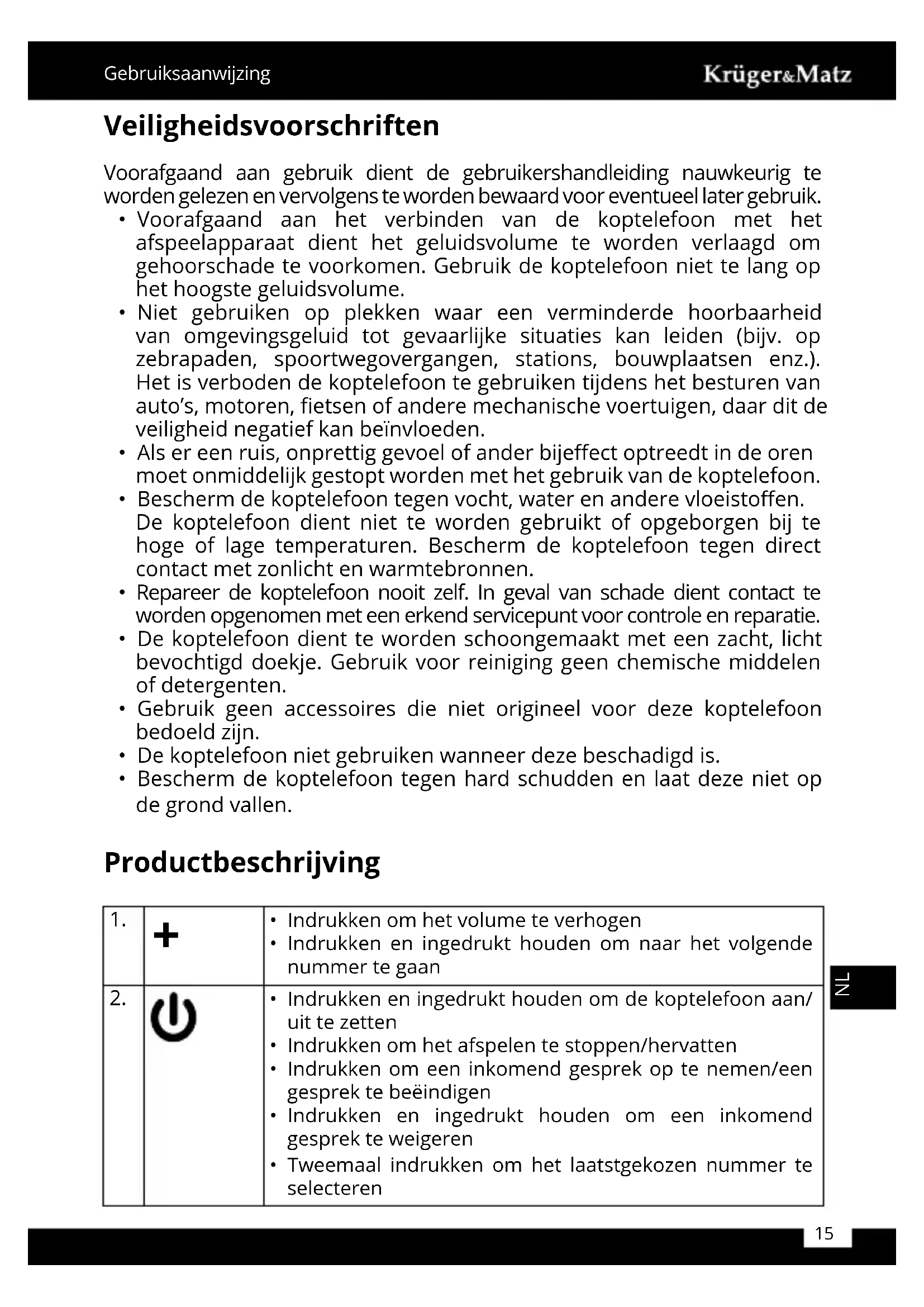 - Niet gebruiken op plekken waar een verminderde hoorbaarheid van omgevingsgeluid tot gevaarlijke situatuies kan leiden (bijv. op zebrapaden, spoortwegovergangen, stations, bouwplaatsen enz.). Het is verboden de koptelefoon te gebruiken tijdens het besturen van auto's, motoren, fietsen of andere Mechanische voertuigen, waar dit deeiligheid negatief kan beinvloeden.