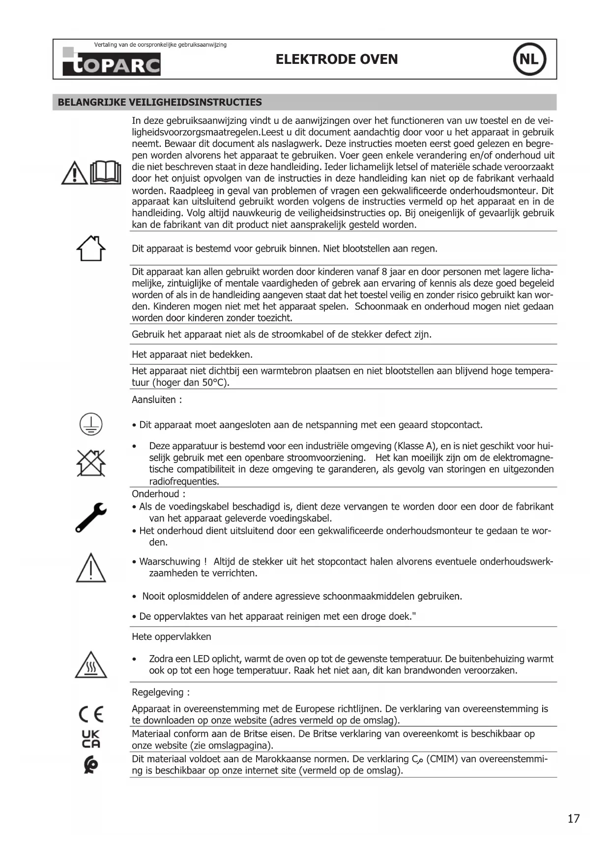 - Zodra een LED oplicht, warmt de oven op tot de gewenste temperatuur. De buitenbehuizing warmt ook op tot een hoge temperatuur. Raak het niet aan, dit kan brandwonden veroorzaken. Regelgeving : Apparaat in overeenstemming met de Europese richtlijnen. De verklaring van overeenstemming is te downloaden op onze website (adres vermeld op de omslag). Materiaal conform aan de Britse eisen. De Britse verklaring van overeenkomt is beschikbaar op onze website (zie omslagpagina). Dit materiaal voldoet aan de Marokkaanse normen. De verklaring Cم (CMIM) van overeenstemmi- ng is beschikbaar op onze internet site (vermeld op de omslag).Vertaling van de oorspronkelijke gebruiksaanwijzing