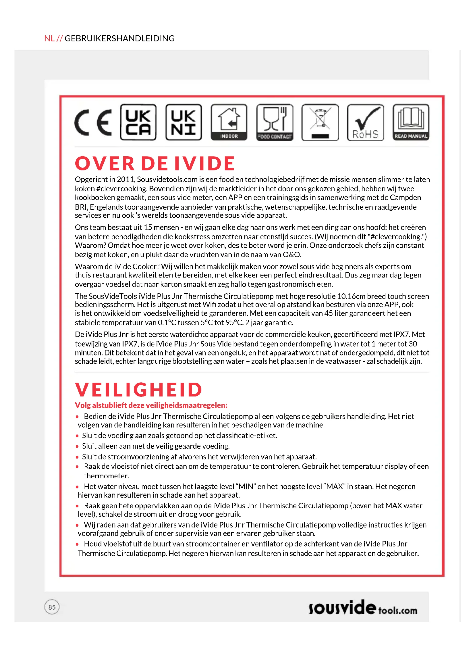 VEILIGHEID Opgericht in 2011, Sousvidetools.com is een food en technologiebedrijf met de missie mensen slimmer te laten koken #clevercooking.Bovendien zijn wij de marktleider in het door ons gekozen gebied, hebben wij twee kookboeken gemaakt, een sous vide meter, een APP en een trainingsgids in samenwerking met de Campden BRI, Engelands toonaangevende aanbieder van praktische, wetenschappelijke, technische en raadgevende services en nu ook 's werelds toonaangevende sous vide apparaat. Ons team bestaat uit 15 mensen - en wij gaan elke dag naar ons werk met een ding aan ons hoofd: het creëren van betere benodigdheden die kookstress omzetten naar etenstijd succes. (Wij noemen dit "#clevercooking.") Waarom? Omdat hoe meer je weet over koken, des te beter word je erin. Onze onderzoek chefs zijn constant bezig met koken, en u plukt daar de vruchten van in de naam van O&O. Waarom de iVide Cooker? Wij willen het makkelijk maken voor zowel sous vide beginners als experts om thuis restaurant kwaliteit eten te bereiden, met elke keer een perfect eindresultaat. Dus zeg maar dag tegen overgaar voedsel dat naar karton smaakt en zeg hallo tegen gastronomisch eten. The SousVideTools iVide Plus Jnr Thermische Circulatiepomp met hoge resolutie 10.16cm breed touch screen bedieningsscherm. Het is uitgerust met Wi zodat u het overal op afstand kan besturen via onze APP, ook is het ontwikkeld om voedselveiligheid te garanderen. Met een capaciteit van 45 liter garandeert het een stabiele temperatuur van 0.1°C tussen 5°C tot 95°C. 2 jaar garantie. De iVide Plus Jnr is het eerste waterdichte apparaat voor de commerciële keuken, gecerticeerd met IPX7. Met toewijzing van IPX7, is de iVide Plus Jnr Sous Vide bestand tegen onderdompeling in water tot 1 meter tot 30 minuten. Dit betekent dat in het geval van een ongeluk, en het apparaat wordt nat of ondergedompeld, dit niet tot schade leidt, echter langdurige blootstelling aan water – zoals het plaatsen in de vaatwasser - zal schadelijk zijn. Volg alstublieft deze veiligheidsmaatregelen: