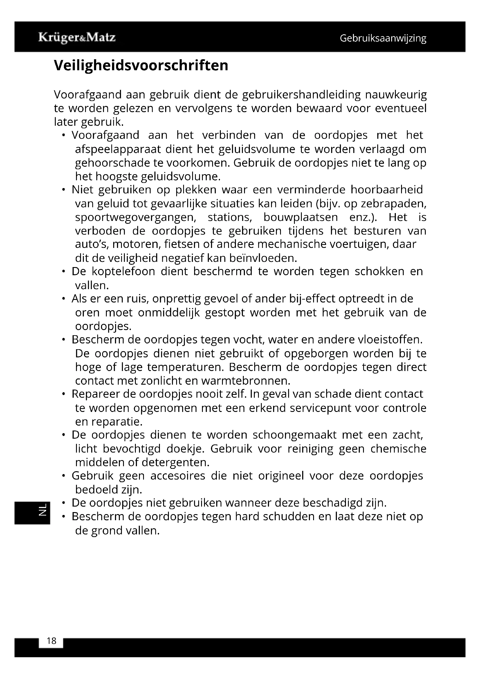 - Niet gebruiken op plekken waar een verminderde hoorbaarheid van geluid tot gevaarlijke situaties kan leiden (bijv. op zebrapaden, spoortwegovergangen, stations, bouwplaatsen enz.). Het is verboden de oordopjes te gebruiken tijdens het besturen van auto’s, motoren, etsen of andere mechanische voertuigen, daar dit de veiligheid negatief kan beïnvloeden.