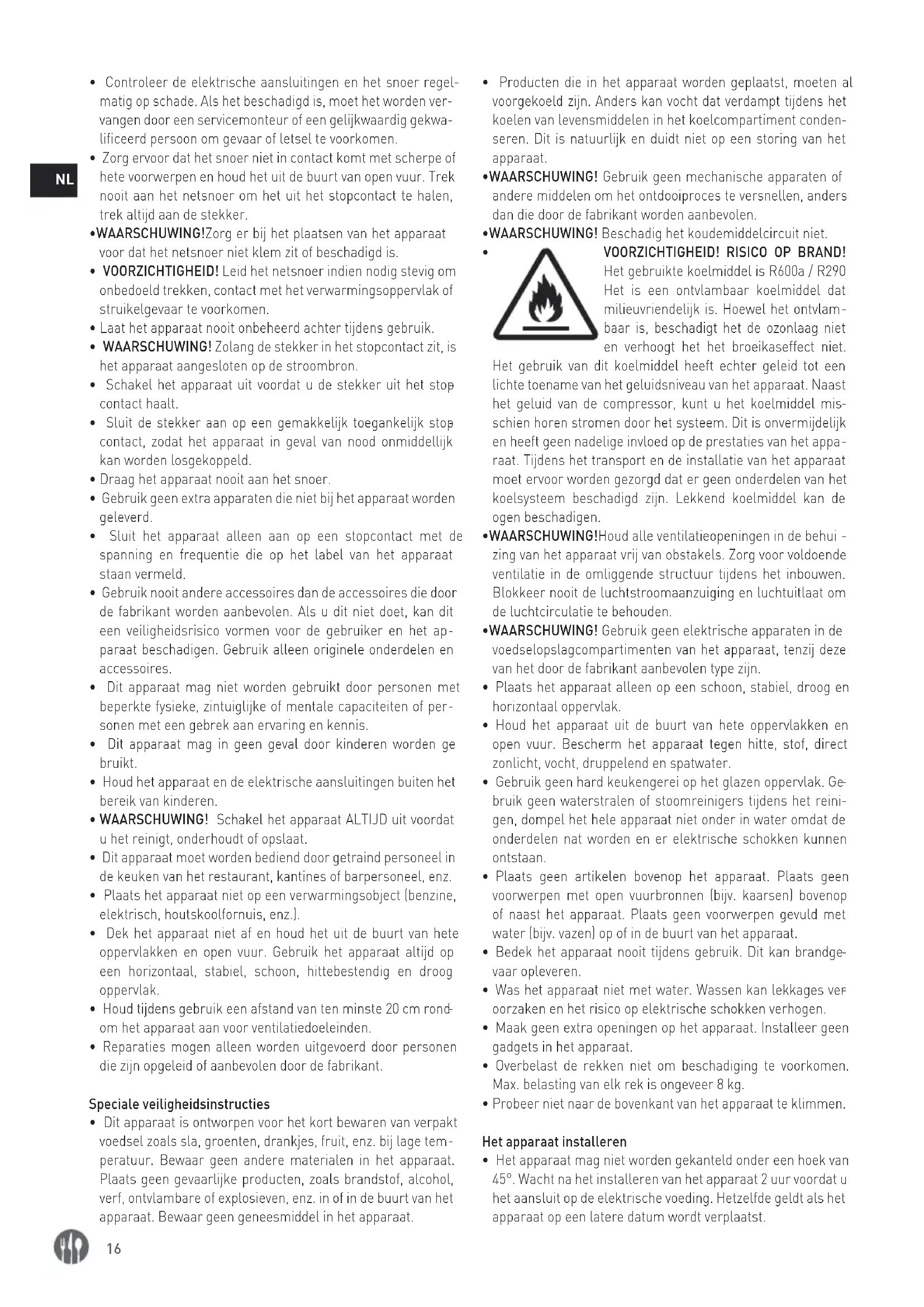 VOORZICHTIGHEID! RISICO OP BRAND! Het gebruikte koelmiddel is R600a / R290 Het is een ontvlambaar koelmiddel dat milieuvriendelijk is. Hoewel het ontvlam