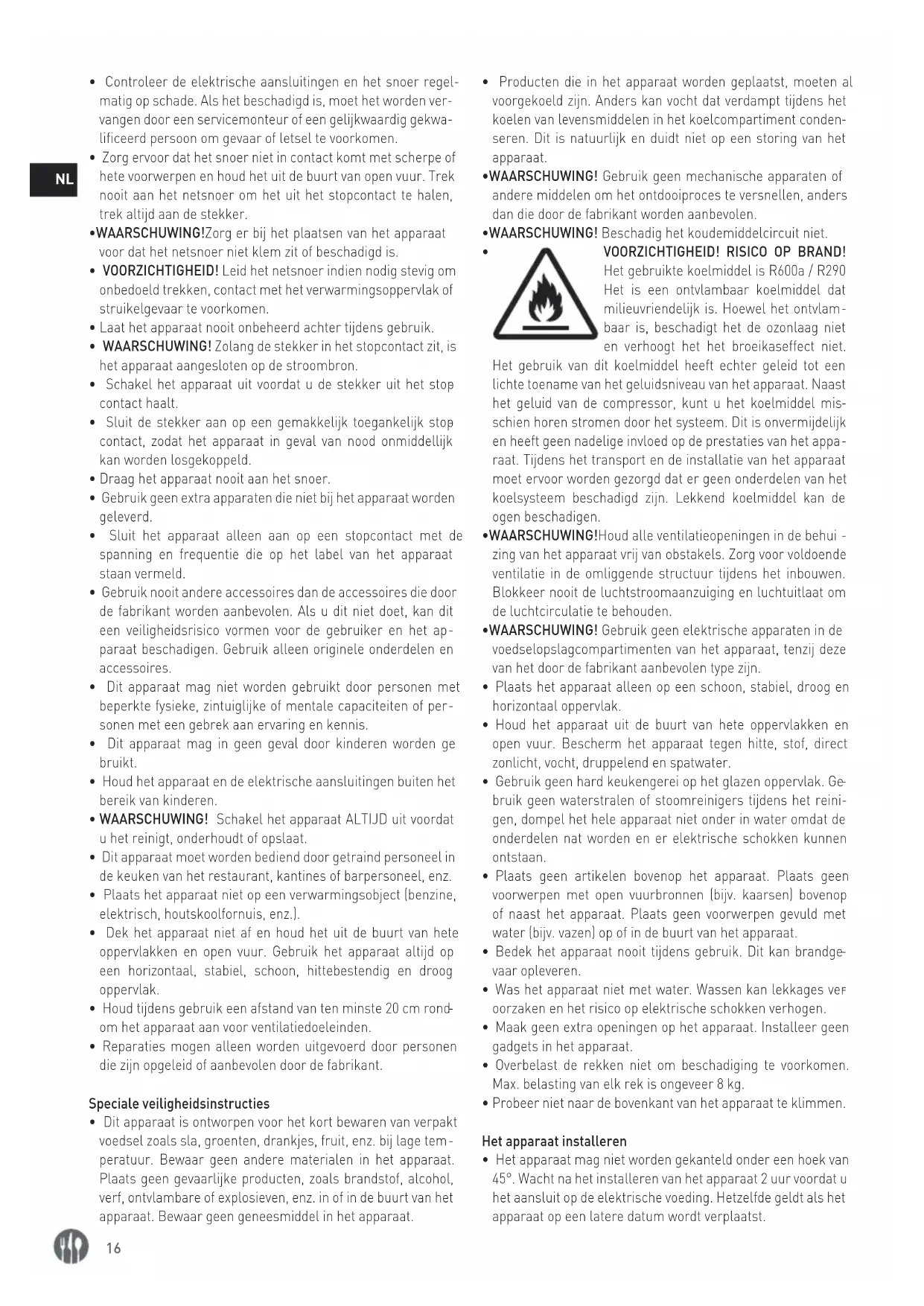 VOORZICHTIGHEID! RISICO OP BRAND! Het gebruikte koelmiddel is R600a / R290 Het is een ontvlambaar koelmiddel dat milieuvriendelijk is. Hoewel het ontvlam