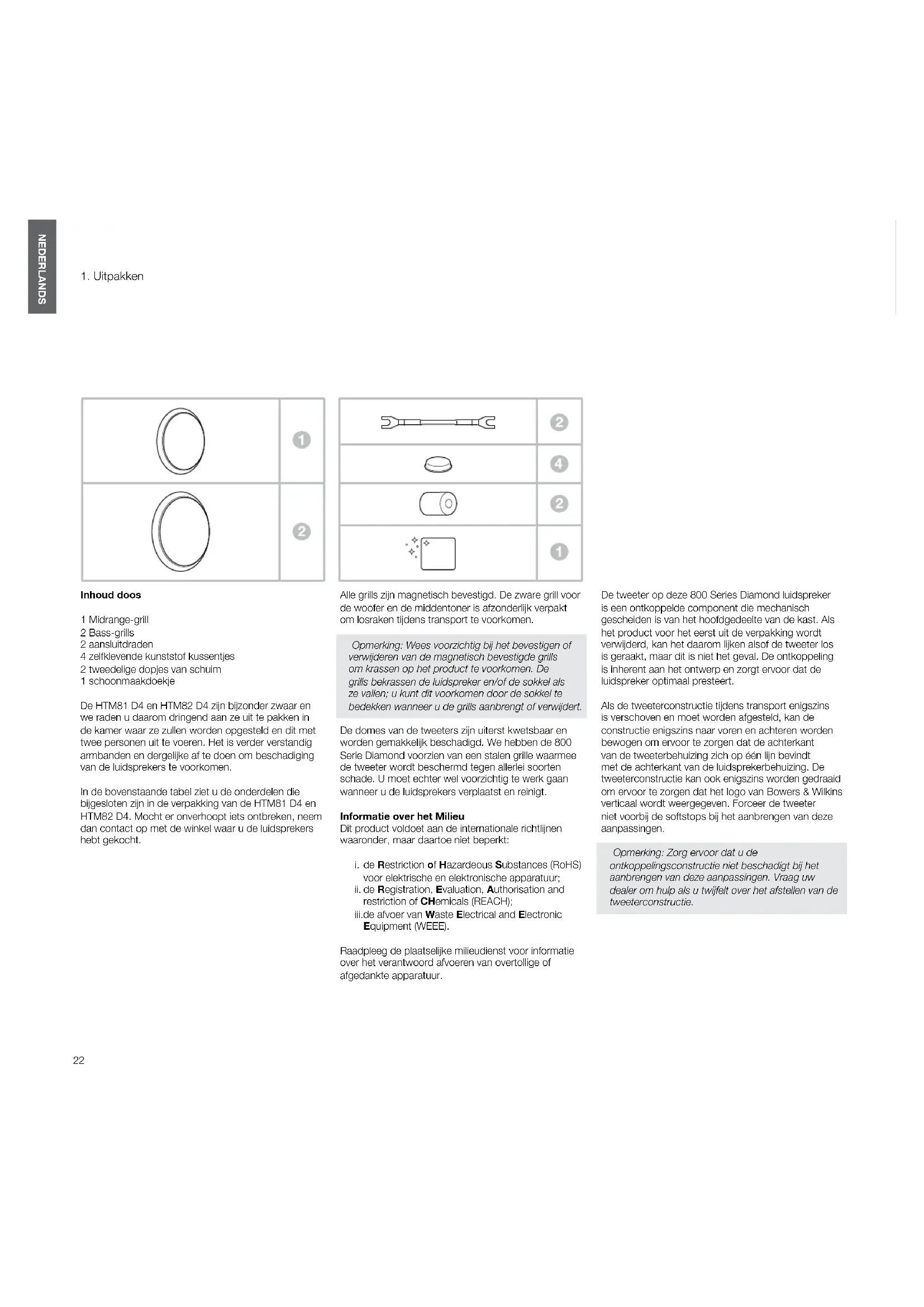 Inhoud doos 1 Midrange-grill 2 Bass-grills 2 aansluitdraden 4 zelfklevende kunststof kussentjes 2 tweedelige dopjes van schuim 1 schoonmaakdoekje De HTM81D4 en HTM82D4 zijn bijzonder zwaar en we raden u daarom dringend aan ze uit te pakken in de kamer waar ze zullen worden opgesteld en dit met twee personen uit te voeren. Het is verder verstandig armbanden en dergelijke af te doen om beschadiging van de luidsprekers te voorkomen. In de bovenstaande tabel ziet u de onderdelen die bijgesloten zijn in de verpakking van de HTM81D4 en HTM82D4. Mocht er onverhoopt iets ontbreken, neem dan contact op met de winkel waar u de luidsprekers hebt gekocht. Alle grills zijn magnetisch bevestigd. De zware grill voor de woofer en de middentoner is afzonderlijk verpakt om losraken tijdens transport te voorkomen. Opmerking:Weesvoorzichtigbijhetbevestigenof verwijderenvandemagnetischbevestigdegrills omkrassenophetproducttevoorkomen.De grillsbekrassendeluidsprekeren/ofdesokkelals zevallen;ukuntditvoorkomendoordesokkelte bedekkenwanneerudegrillsaanbrengtofverwijdert. De domes van de tweeters zijn uiterst kwetsbaar en worden gemakkelijk beschadigd. We hebben de 800 Serie Diamond voorzien van een stalen grille waarmee de tweeter wordt beschermd tegen allerlei soorten schade. U moet echter wel voorzichtig te werk gaan wanneer u de luidsprekers verplaatst en reinigt. Informatie over het Milieu Dit product voldoet aan de internationale richtlijnen waaronder, maar daartoe niet beperkt: