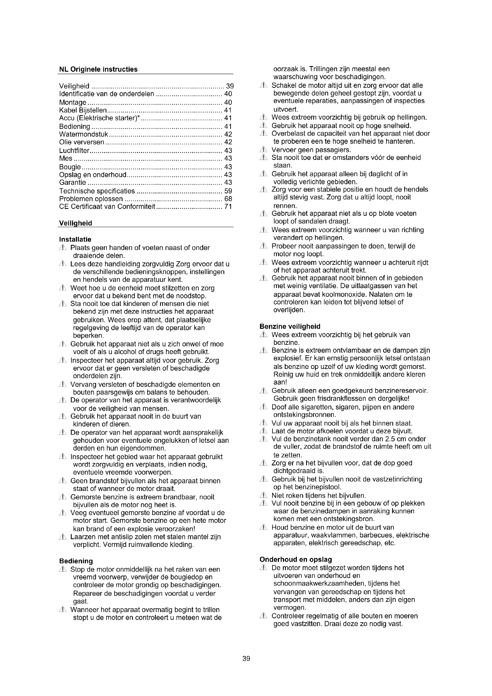 - CE Certificaat van Conformiteit Veiligheid Installatie Plaats geen handen of voeten naast of onder draaiende delen. Lees deze handleiding zorgvuldig Zorg ervoor dat u de verschillende bedieningsknoppen, instellingen en hendels van de apparatuur kent. Weet hoe u de eenheid moet stilzetten en zorg ervoor dat u bekend bent met de noodstop. Sta nooit toe dat kinderen of mensen die niet bekend zijn met deze instructies het apparaat gebruiken. Wees erop attent, dat plaatselijke regelgeving de leeftijd van de operator kan beperken. Gebruik het apparaat niet als u zich onwel of moe voelt of als u alcohol of drugs heeft gebruikt. Inspecteer het apparaat altijd voor gebruik. Zorg ervoor dat er geen versleten of beschadigde onderdelen zijn. Vervang versleten of beschadigde elementen en bouten paarsgewijs om balans te behouden. De operator van het apparaat is verantwoordelijk voor de veiligheid van mensen. Gebruik het apparaat nooit in de buurt van kinderen of dieren. De operator van het apparaat wordt aansprakelijk gehouden voor eventuele ongelukken of letsel aan derden en hun eigendommen. Inspecteer het gebied waar het apparaat gebruikt wordt zorgvuldig en verplaats, indien nodig, eventuele vreemde voorwerpen. Geen brandstof bijvullen als het apparaat binnen staat of wanneer de motor draait. Gemorste benzine is extreem brandbaar, nooit bijvullen als de motor nog heet is. Veeg eventueel gemorste benzine af voordat u de motor start. Gemorste benzine op een hete motor kan brand of een explosie veroorzaken! Laarzen met antislip zolen met stalen mantel zijn verplicht. Vermijd ruimvallende kleding. Bediening Stop de motor onmiddellijk na het raken van een vreemd voorwerp, verwijder de bougiedop en controleer de motor grondig op beschadigingen. Repareer de beschadigingen voordat u verder gaat. Wanneer het apparaat overmatig begint te trillen stopt u de motor en controleert u meteen wat de oorzaak is. Trillingen zijn meestal een waarschuwing voor beschadigingen. Schakel de motor altijd uit en zorg ervoor dat alle bewegende delen geheel gestopt zijn, voordat u eventuele reparaties, aanpassingen of inspecties uitvoert. Wees extreem voorzichtig bij gebruik op hellingen. Gebruik het apparaat nooit op hoge snelheid. Overbelast de capaciteit van het apparaat niet door te proberen een te hoge snelheid te hanteren. Vervoer geen passagiers. Sta nooit toe dat er omstanders vóór de eenheid staan. Gebruik het apparaat alleen bij daglicht of in volledig verlichte gebieden. Zorg voor een stabiele positie en houdt de hendels altijd stevig vast. Zorg dat u altijd loopt, nooit rennen. Gebruik het apparaat niet als u op blote voeten loopt of sandalen draagt. Wees extreem voorzichtig wanneer u van richting verandert op hellingen. Probeer nooit aanpassingen te doen, terwijl de motor nog loopt. Wees extreem voorzichtig wanneer u achteruit rijdt of het apparaat achteruit trekt. Gebruik het apparaat nooit binnen of in gebieden met weinig ventilatie. De uitlaatgassen van het apparaat bevat koolmonoxide. Nalaten om te controleren kan leiden tot blijvend letsel of overlijden. Benzine veiligheid Wees extreem voorzichtig bij het gebruik van benzine. Benzine is extreem ontvlambaar en de dampen zijn explosief. Er kan ernstig persoonlijk letsel ontstaan als benzine op uzelf of uw kleding wordt gemorst. Reinig uw huid en trek onmiddellijk andere kleren aan! Gebruik alleen een goedgekeurd benzinereservoir. Gebruik geen frisdrankflessen en dergelijke! Doof alle sigaretten, sigaren, pijpen en andere ontstekingsbronnen. Vul uw apparaat nooit bij als het binnen staat. Laat de motor afkoelen voordat u deze bijvult. Vul de benzinetank nooit verder dan 2.5 cm onder de vuller, zodat de brandstof de ruimte heeft om uit te zetten. Zorg er na het bijvullen voor, dat de dop goed dichtgedraaid is. Gebruik bij het bijvullen nooit de vastzetinrichting op het benzinepistool. Niet roken tijdens het bijvullen. Vul nooit benzine bij in een gebouw of op plekken waar de benzinedampen in aanraking kunnen komen met een ontstekingsbron. Houd benzine en motor uit de buurt van apparatuur, waakvlammen, barbecues, elektrische apparaten, elektrisch gereedschap, etc. Onderhoud en opslag De motor moet stilgezet worden tijdens het uitvoeren van onderhoud en schoonmaakwerkzaamheden, tijdens het vervangen van gereedschap en tijdens het transport met middelen, anders dan zijn eigen vermogen. Controleer regelmatig of alle bouten en moeren goed vastzitten. Draai deze zo nodig vast.40 De motor moet compleet afgekoeld zijn, voordat u het apparaat binnen in de stalling zet of afdekt. Wanneer het apparaat enige tijd niet gebruikt is, leest u dan de instructies in deze handleiding. Bewaar of vervang zo nodig veiligheids- en instructielabels. Gebruik alleen originele reserveonderdelen of accessoires. Wanneer geen originele onderdelen of accessoires worden gebruikt, vervalt de aansprakelijkheid. Overig De motor wordt niet gevuld met olie geleverd. Controleer voor het starten altijd het oliepeil. In de fabriek gemonteerde besturingsapparaten, zoals de op een hendel bevestigde koppelingskabel, mogen niet verwijderd of blootgesteld worden. Laat de benzinetank alleen in de buitenlucht leeglopen. Benzine is extreem ontvlambaar en de dampen zijn explosief. Zorg ervoor dat het apparaat goed is vastgezet tijdens het transport op een open laadbak etc. p. 71