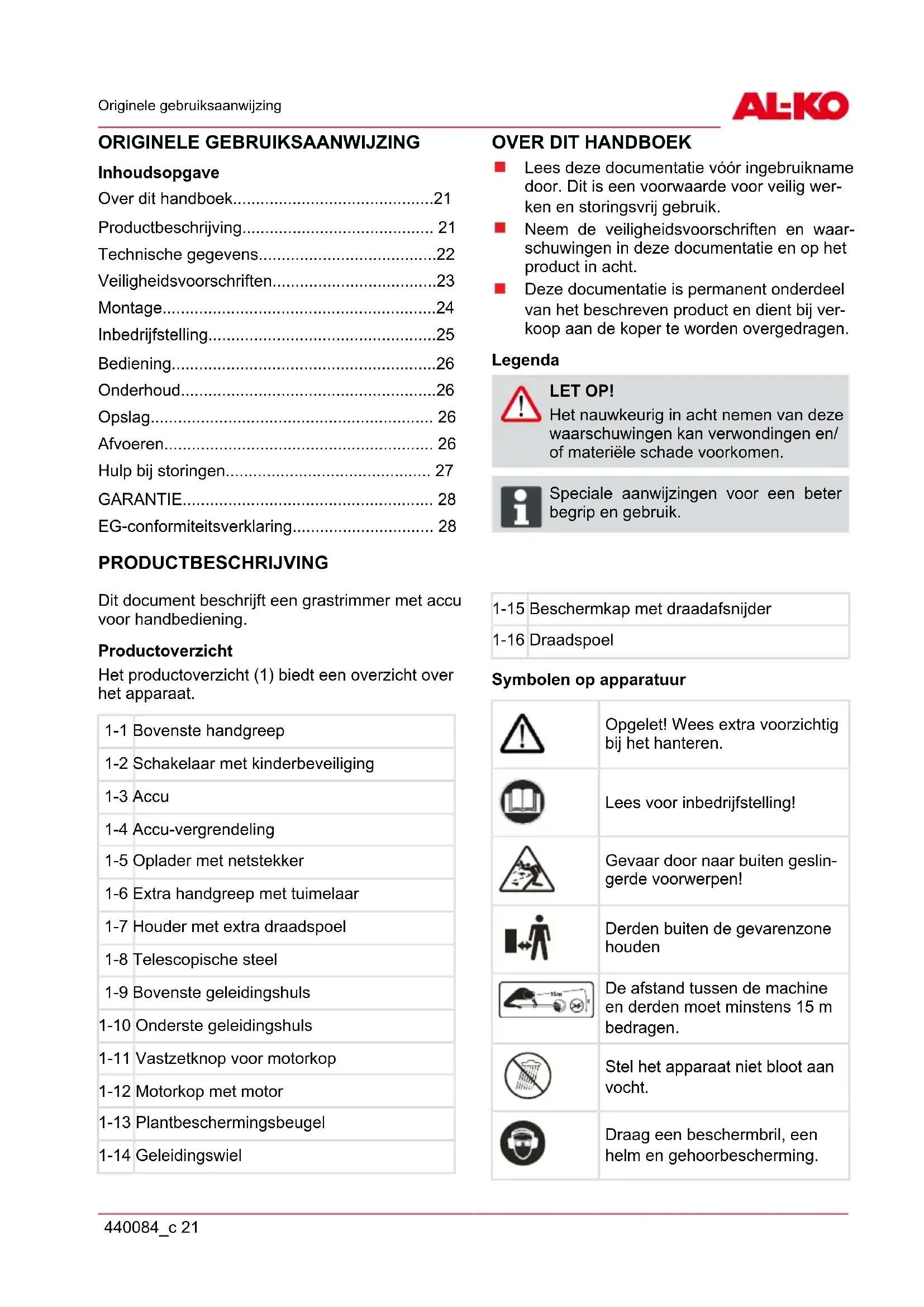 Storing Mogelijke oorzaak Oplossing Motor loopt niet Motorbeveiligingsschakelaar ging over tot uitschakeling. Accu leeg Wacht tot de motorbeveiligings- schakelaar de trimmer weer inschakelt. Accu laden Trimmer vibreert Draadspoel is vuil Draadspoel reinigen, indien nodig vervangen Het vermogen van de accu neemt duidelijk af Gras te hoog of te nat Maaihoogte is te gering Accu leeg want langere tijd niet in gebruik Levensduur van accu verbruikt Laten drogen, maaihoogte hoger instellen Maaihoogte hoger instellen Accu laden Accu vervangen Gebruik alleen originele toebehoren van de fabri- kant Accu kan niet worden op- geladen Laadstekker of contactbus vuil Accu of oplader defect Reserveonderdeel van reserveon- derdelenlijst bestellen ADVICE Bij storingen die niet in deze tabel worden vermeld of in geval van storingen die u niet zelf kunt oplossen, wendt u zich aan onze verantwoordelijke klantenservice a.u.b.nl GARANTIE 28 GTLi 18V GARANTIE Eventuele materiaal- of fabricagefouten aan het apparaat verhelpen we gedurende de wettelijke termijn voor garantieaanspraken naar onze keuze door reparatie of een vervangende levering. Deze garantie- termijn wordt bepaald door de wetgeving in het land, waar het apparaat is gekocht. Onze garantietoezegging geldt enkel bij: correcte behandeling van het apparaat inachtneming van de bedieningshandleiding gebruik van originele reserveonderdelen De garantie vervalt bij: pogingen tot reparatie van het apparaat technische wijzigingen aan het apparaat gebruik dat niet in overeenstemming is met de bestemming Uitgesloten van de garantie zijn: lakschade die is veroorzaakt door normale slijtage slijtageonderdelen, die op de kaart met reserveonderdelen zijn gekenmerkt met de omkadering [xxx xxx (x)] verbrandingsmotoren (hiervoor gelden de aparte garantiebepalingen van de betreffende motorfabri- kant) De garantieperiode begint op de aankoop door de eerste eindgebruiker. Bepalend is de datum van het ontvangstbewijs. Bij garantieaanspraken kunt u zich met deze garantieverklaring en het aankoopbewijs wenden tot de distributeur o f de bevoegde klantenservice bij u in de buurt. Met deze garantietoezegging blijven de wettelijke aanspraken bij gebreken van de koper tegenover de verkoper onverkort van kracht. EG-CONFORMITEITSVERKLARING Hierbij verklaren wij dat dit product in de door ons uitgebrachte uitvoering voldoet aan de eisen vastgelegd in de geharmoniseerde EU- richtlijnen, de EU-veiligheidsnormen en de standaardproductspecificaties. Product Fabrikant Gevolmachtigde Accu-grastrimmer Type GTLi 18V AL-KO Geräte GmbH Ichenhauser Str. 14 D-89359 Kötz Andreas Hedrich Ichenhauser Str. 14 D-89359 Kötz Serienummer EU-richtlijnen Geharmoniseerde normen G130130 Geluidsniveau EN ISO 3744 gemeten / gegarandeerd 90 / 92 dB(A) 2006/42/EC 2014/30/EU 2000/14/EC 2014/35/EU 2011/65/EU EN 60745-1 EN 786 EN 55014-1 EN 55014-2 EN 61000-3-2 EN 61000-3-3 EN 60335-1 EN 60335-2-29 EN 62233 Beoordelende instantie Beoordeling van conformiteit Kötz, 23.06.2016 Société Nationale de Certification et d'Homologation No. 0499 2000/14/EC Appendix VI Wolfgang Hergeth Managing DirectorMode d'emploi originale 440084_c 29