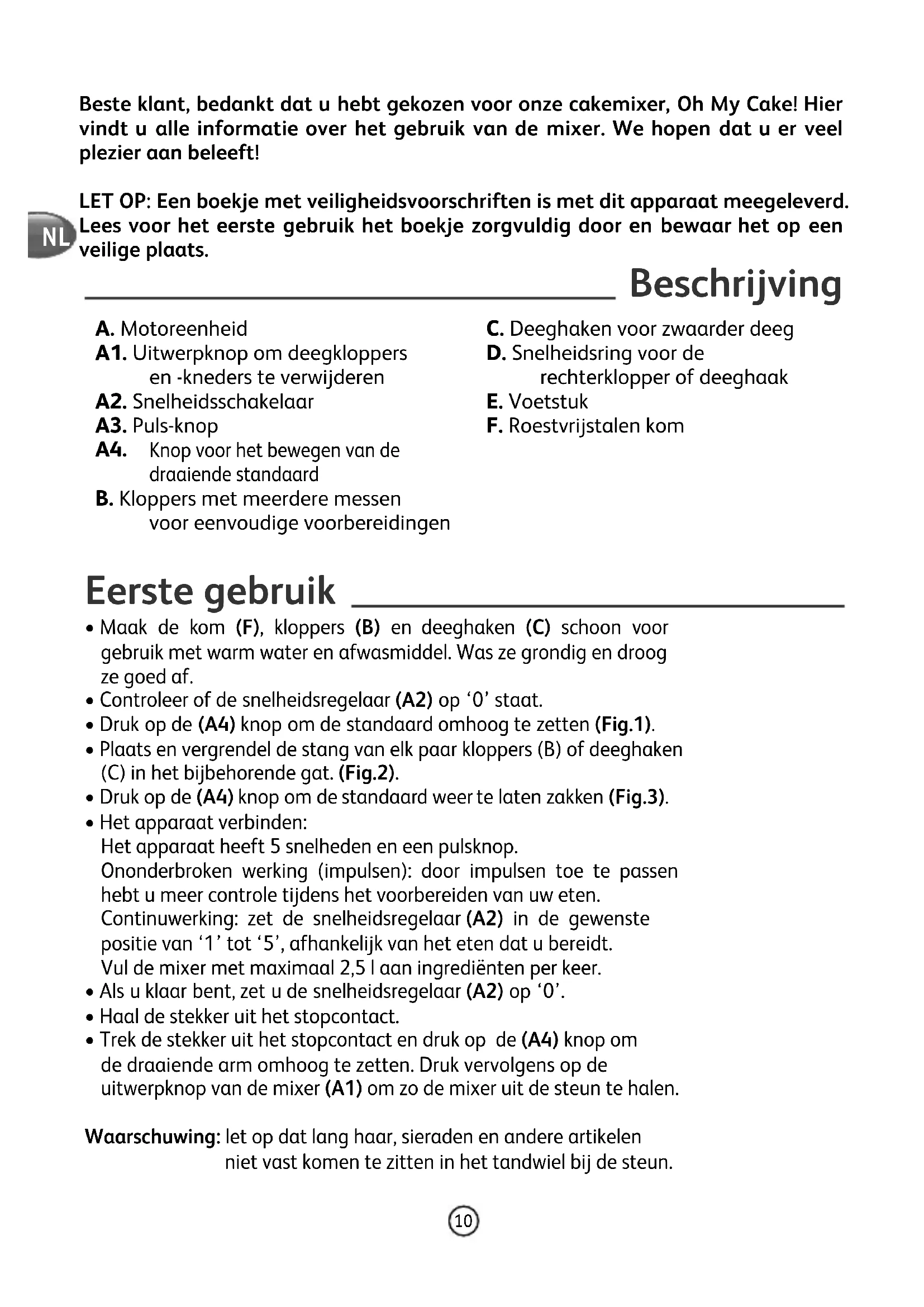 Beschrijving A. Motoreenheid A1. Uitwerpknop om deegkloppers en -kneders te verwijderen A2. Snelheidsschakelaar A3. Puls-knop A4. Knop voor het bewegen van de draaiende standaard B. Kloppers met meerdere messen voor eenvoudige voorbereidingen C. Deeghaken voor zwaarder deeg D. Snelheidsring voor de rechterklopper of deeghaak E. Voetstuk F. Roestvrijstalen kom Eerste gebruik