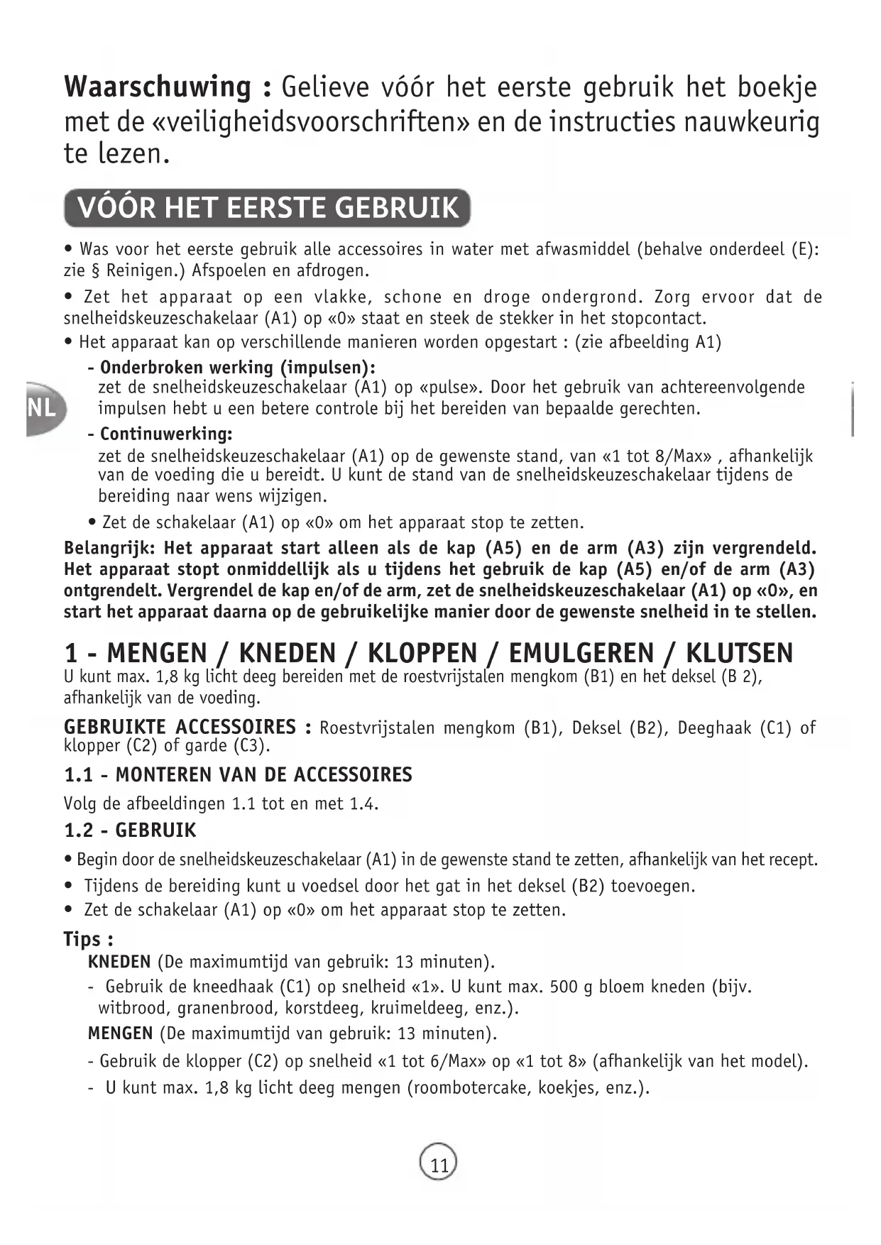 - Begin door de snelheidskeuzeschakelaar (A1) in de gewenste stand te zetten, afhankelijk van het recept.• Tijdens de bereiding kunt u voedsel door het gat in het deksel (B2) toevoegen.• Zet de schakelaar (A1) op «0» om het apparaat stop te zetten. Tips : KNEDEN (De maximumtijd van gebruik: 13 minuten).- Gebruik de kneedhaak (C1) op snelheid «1». U kunt max. 500 g bloem kneden (bijv. witbrood, granenbrood, korstdeeg, kruimeldeeg, enz.).MENGEN (De maximumtijd van gebruik: 13 minuten).- Gebruik de klopper (C2) op snelheid «1 tot 6/Max» op «1 tot 8» (afhankelijk van het model).- U kunt max. 1,8 kg licht deeg mengen (roombotercake, koekjes, enz.).NL
