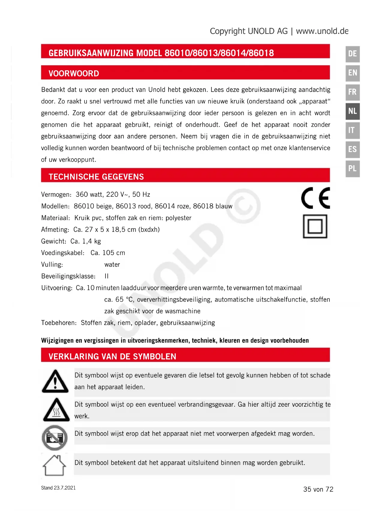 fijnwasmiddel) worden gewassen of in chemisch worden gereinigd. Altijd hangend, niet liggend, drogen. Indien nodig op stand 2 (max. 120 °C) strijken. Laat de stoffen zak volledig drogen voordat u deze weer gebruikt. Attentie: Stoffen zak en riem nooit in de droger drogen. Copyright UNOLD AG | www.unold.de UNOLD ©42 von 72 Stand 23.7.2021