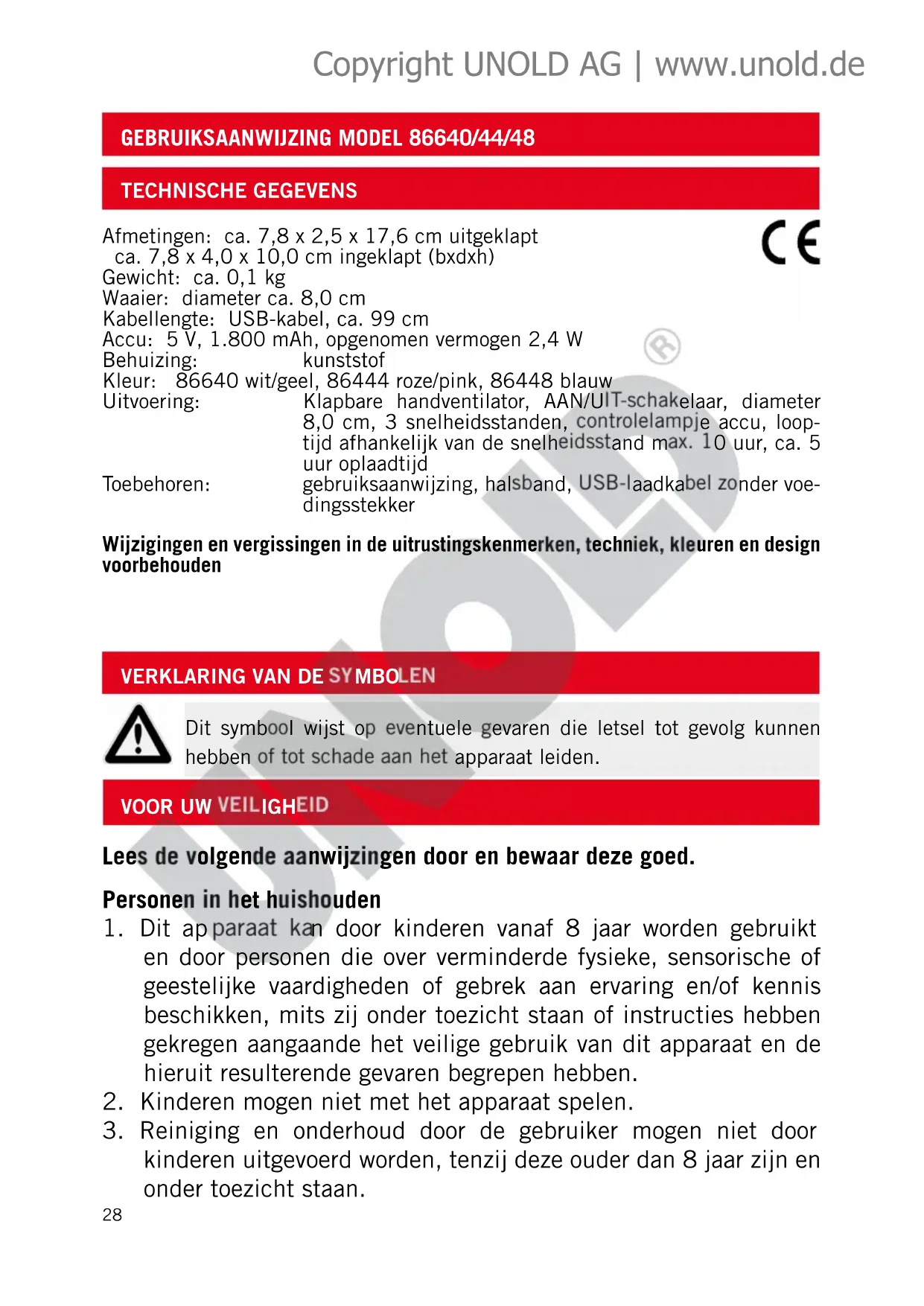 Dit symbool wijst op eventuele gevaren die letsel tot gevolg kunnen hebben of tot schade aan het apparaat leiden. Afmetingen: ca. 7,8 x 2,5 x 17,6 cm uitgeklapt ca. 7,8 x 4,0 x 10,0 cm ingeklapt (bxdxh) Gewicht: ca. 0,1 kg Waaier: diameter ca. 8,0 cm Kabellengte: USB-kabel, ca. 99 cm Accu: 5 V, 1.800 mAh, opgenomen vermogen 2,4 W Behuizing: kunststof Kleur: 86640 wit/geel, 86444 roze/pink, 86448 blauw Uitvoering: Klapbare handventilator, AAN/UIT-schakelaar, diameter 8,0 cm, 3 snelheidsstanden, controlelampje accu, loop- tijd afhankelijk van de snelheidsstand max. 10 uur, ca. 5 uur oplaadtijd Toebehoren: gebruiksaanwijzing, halsband, USB-laadkabel zonder voe- dingsstekker Wijzigingen en vergissingen in de uitrustingskenmerken, techniek, kleuren en design voorbehouden Copyright UNOLD AG | www.unold.de29