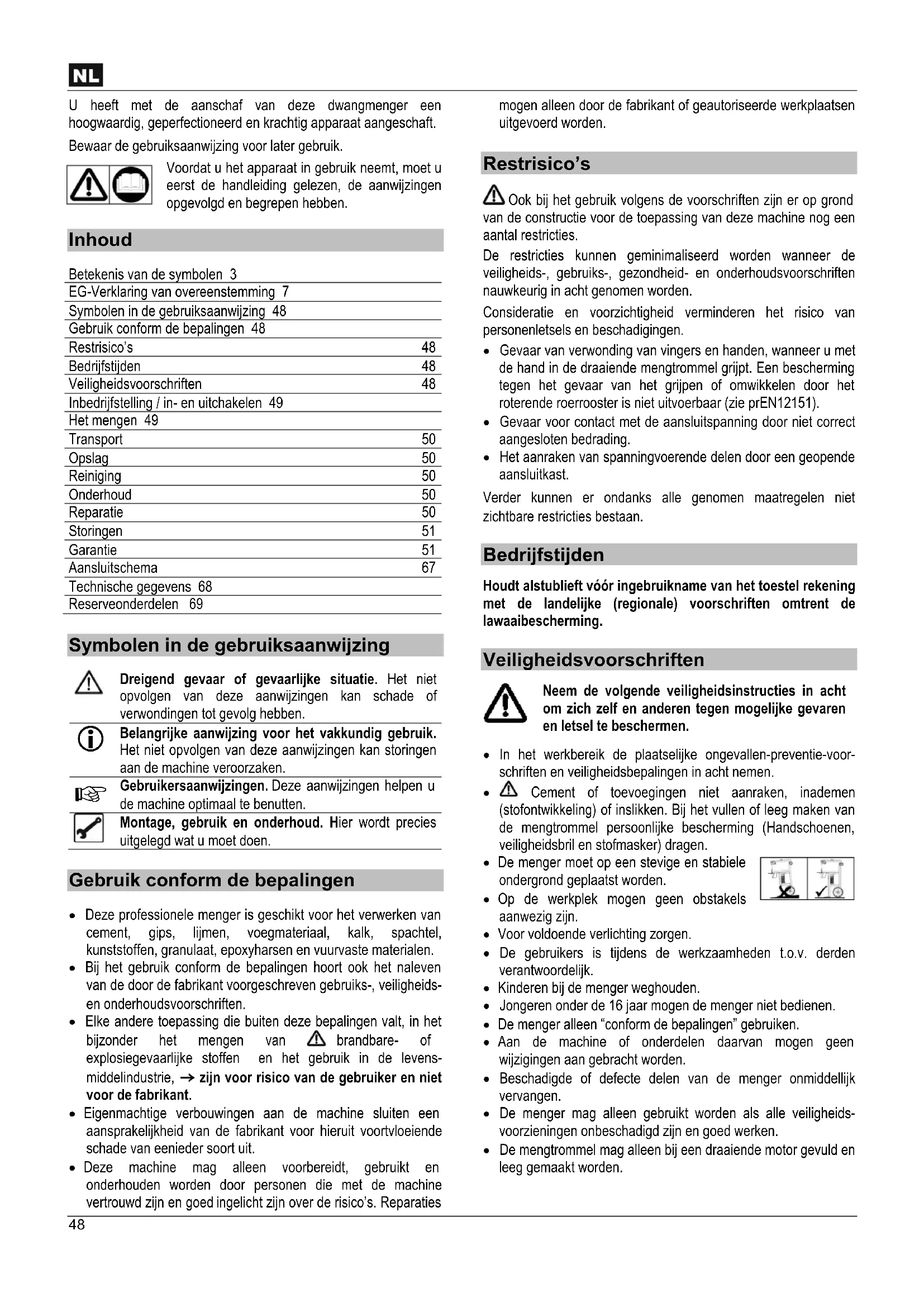 Garanti Vennligst ta hensyn til den vedlagte garantierklæringen.48 U heeft met de aanschaf van deze dwangmenger een hoogwaardig, geperfectioneerd en krachtig apparaat aangeschaft. Bewaar de gebruiksaanwijzing voor later gebruik. Voordat u het apparaat in gebruik neemt, moet u eerst de handleiding gelezen, de aanwijzingen opgevolgd en begrepen hebben. Inhoud Betekenis van de symbolen 3 EG-Verklaring van overeenstemming 7 Symbolen in de gebruiksaanwijzing 48 Gebruik conform de bepalingen 48 Restrisico’s 48 Bedrijfstijden 48 Veiligheidsvoorschriften 48 Inbedrijfstelling / in- en uitchakelen 49 Het mengen 49 Transport 50 Opslag 50 Reiniging 50 Onderhoud 50 Reparatie 50 Storingen 51 Garantie 51 Aansluitschema 67 Technische gegevens 68 Reserveonderdelen 69 Symbolen in de gebruiksaanwijzing