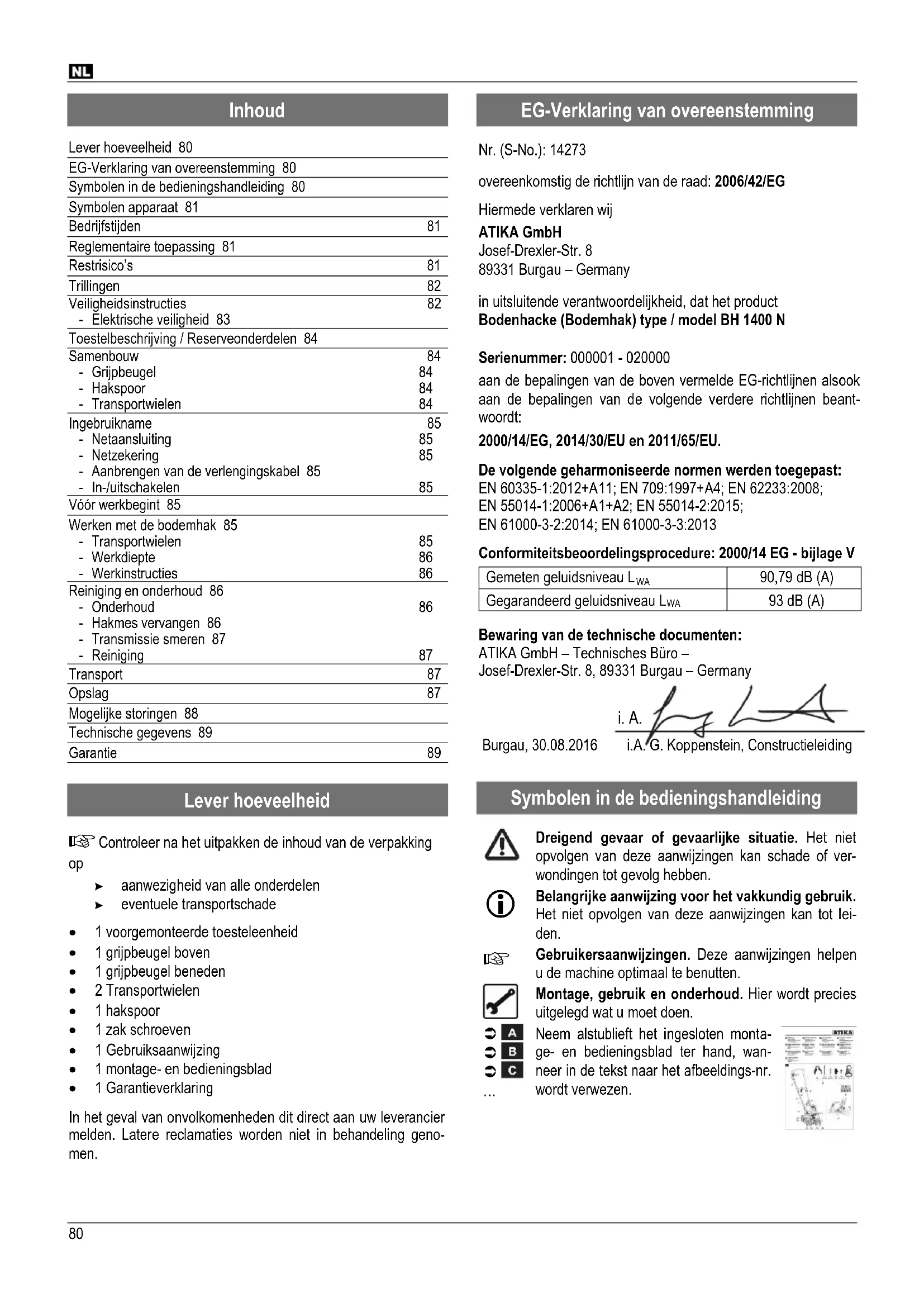 EG-Verklaring van overeenstemming Nr. (S-No.): 14273 overeenkomstig de richtlijn van de raad: 2006/42/EG Hiermede verklaren wij ATIKA GmbH Josef-Drexler-Str. 8 89331 Burgau – Germany in uitsluitende verantwoordelijkheid, dat het product Bodenhacke (Bodemhak) type / model BH 1400 N Serienummer: 000001 - 020000 aan de bepalingen van de boven vermelde EG-richtlijnen alsook aan de bepalingen van de volgende verdere richtlijnen beant- woordt: 2000/14/EG, 2014/30/EU en 2011/65/EU. De volgende geharmoniseerde normen werden toegepast: EN 60335-1:2012+A11; EN 709:1997+A4; EN 62233:2008; EN 55014-1:2006+A1+A2; EN 55014-2:2015; EN 61000-3-2:2014; EN 61000-3-3:2013 Conformiteitsbeoordelingsprocedure: 2000/14 EG - bijlage V Gemeten geluidsniveau L