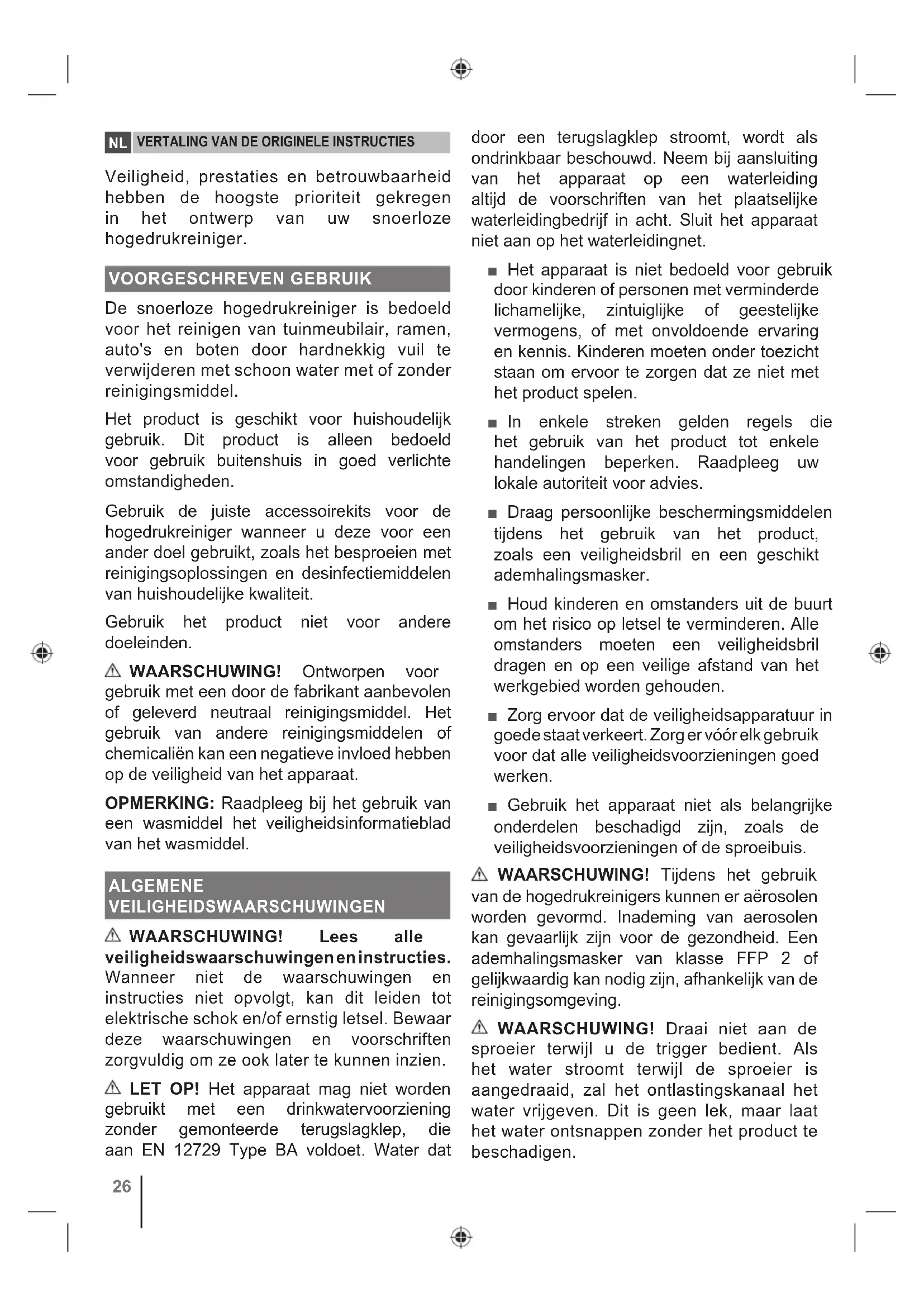 Veiligheid, prestaties en betrouwbaarheid hebben de hoogste prioriteit gekregen in het ontwerp van uw snoerloze hogedrukreiniger. VOORGESCHREVEN GEBRUIK De snoerloze hogedrukreiniger is bedoeld voor het reinigen van tuinmeubilair, ramen, auto's en boten door hardnekkig vuil te verwijderen met schoon water met of zonder reinigingsmiddel. Het product is geschikt voor huishoudelijk gebruik. Dit product is alleen bedoeld voor gebruik buitenshuis in goed verlichte omstandigheden. Gebruik de juiste accessoirekits voor de hogedrukreiniger wanneer u deze voor een ander doel gebruikt, zoals het besproeien met reinigingsoplossingen en desinfectiemiddelen van huishoudelijke kwaliteit. Gebruik het product niet voor andere doeleinden. WAARSCHUWING! Ontworpen voor gebruik met een door de fabrikant aanbevolen of geleverd neutraal reinigingsmiddel. Het gebruik van andere reinigingsmiddelen of chemicaliën kan een negatieve invloed hebben op de veiligheid van het apparaat. OPMERKING: Raadpleeg bij het gebruik van een wasmiddel het veiligheidsinformatieblad van het wasmiddel. ALGEMENE VEILIGHEIDSWAARSCHUWINGEN WAARSCHUWING! Lees alle veiligheidswaarschuwingen en instructies. Wanneer niet de waarschuwingen en instructies niet opvolgt, kan dit leiden tot elektrische schok en/of ernstig letsel. Bewaar deze waarschuwingen en voorschriften zorgvuldig om ze ook later te kunnen inzien. LET OP! Het apparaat mag niet worden gebruikt met een drinkwatervoorziening zonder gemonteerde terugslagklep, die aan EN 12729 Type BA voldoet. Water dat door een terugslagklep stroomt, wordt als ondrinkbaar beschouwd. Neem bij aansluiting van het apparaat op een waterleiding altijd de voorschriften van het plaatselijke waterleidingbedrijf in acht. Sluit het apparaat niet aan op het waterleidingnet. ■ Het apparaat is niet bedoeld voor gebruik door kinderen of personen met verminderde lichamelijke, zintuiglijke of geestelijke vermogens, of met onvoldoende ervaring en kennis. Kinderen moeten onder toezicht staan om ervoor te zorgen dat ze niet met het product spelen. ■ In enkele streken gelden regels die het gebruik van het product tot enkele handelingen beperken. Raadpleeg uw lokale autoriteit voor advies. ■ Draag persoonlijke beschermingsmiddelen tijdens het gebruik van het product, zoals een veiligheidsbril en een geschikt ademhalingsmasker. ■ Houd kinderen en omstanders uit de buurt om het risico op letsel te verminderen. Alle omstanders moeten een veiligheidsbril dragen en op een veilige afstand van het werkgebied worden gehouden. ■ Zorg ervoor dat de veiligheidsapparatuur in goede staat verkeert. Zorg er vóór elk gebruik voor dat alle veiligheidsvoorzieningen goed werken. ■ Gebruik het apparaat niet als belangrijke onderdelen beschadigd zijn, zoals de veiligheidsvoorzieningen of de sproeibuis. WAARSCHUWING! Tijdens het gebruik van de hogedrukreinigers kunnen er aërosolen worden gevormd. Inademing van aerosolen kan gevaarlijk zijn voor de gezondheid. Een ademhalingsmasker van klasse FFP 2 of gelijkwaardig kan nodig zijn, afhankelijk van de reinigingsomgeving. WAARSCHUWING! Draai niet aan de sproeier terwijl u de trigger bedient. Als het water stroomt terwijl de sproeier is aangedraaid, zal het ontlastingskanaal het water vrijgeven. Dit is geen lek, maar laat het water ontsnappen zonder het product te beschadigen. 26WAARSCHUWING! Bij onjuist gebruik is een hogedrukstraal gevaarlijk. Richt de straal niet op mensen, ingeschakelde elektrische apparaten, of op het apparaat zelf. ■ Om explosiegevaar te vermijden, niet met brandbare vloeistoffen spuiten. ■ Richt de straal niet rechtstreeks op uzelf of anderen om kleding of schoenen te reinigen. ■ Slangen, fittingen en koppelingen zijn belangrijk voor de veiligheid van het apparaat. Gebruik alleen door de fabrikant aanbevolen slangen, fittingen en koppelingen. ■ Controleer het apparaat vóór elk gebruik op schade. Beschadigde slangen moeten onmiddellijk worden vervangen. Zorg ervoor dat alle aansluitingen, zoals sproeistok en spruitstuk, goed vastzitten. Wikkel de slang correct af, zodat deze niet wordt gedraaid of geknikt. ■ Sluit deuren en ramen voordat u gaat reinigen. Verwijder vuil, speelgoed, tuinmeubilair, of andere voorwerpen die gevaar kunnen opleveren uit het te reinigen gebied. ■ Het apparaat niet gebruiken in temperaturen onder 0 °C. ■ Gebruik geen zuren, logen, oplosmiddelen, brandbaar materiaal, bleekmiddelen, of industriële oplossingen in het apparaat. Deze producten kunnen lichamelijk letsel aan de gebruiker, en onherstelbare schade aan het apparaat veroorzaken. ■ Houd de handgreep stevig met twee handen vast. Door reactieve krachten komt de trekker in beweging bij het overhalen van de trekker. Wanneer u hier niet op bent voorbereid, kunt u de controle over het apparaat verliezen en letsel aan uzelf en anderen toebrengen. ■ Wees voorzichtig om uitglijden of vallen te voorkomen. ■ Ga altijd stevig op uw benen staan en reik niet te ver weg met uw arm. Overrek u niet. Overreiken kan leiden tot evenwichtsverlies en ernstige verwondingen. ■ Laat het apparaat tijdens gebruik nooit onbeheerd achter. Schakel het product uit. Verlaat het apparaat niet totdat het volledig tot stilstand is gekomen. Houd het apparaat buiten het bereik van kinderen wanneer het is ingeschakeld. ■ Wees vertrouwd met alle bedieningen en het correct gebruik van het product. Leer hoe u het apparaat kunt stopzetten en de druk snel kunt ontlasten. ■ Wees altijd oplettend en zorg dat u uw gereedschap de baas blijft. Concentreer u op wat u doet en gebruik uw gezonde verstand. ■ Gebruik het product niet wanneer u moe, ziek of onder de invloed bent van alcohol, drugs of medicijnen. Een ogenblik van onoplettendheid tijdens het gebruik van het product kan leiden tot ernstige persoonlijke letsels. ■ Gebruik het product niet als de schakelaar het product niet in- of uitschakelt. Een product dat niet met de schakelaar kan worden bediend, is gevaarlijk en moet worden g