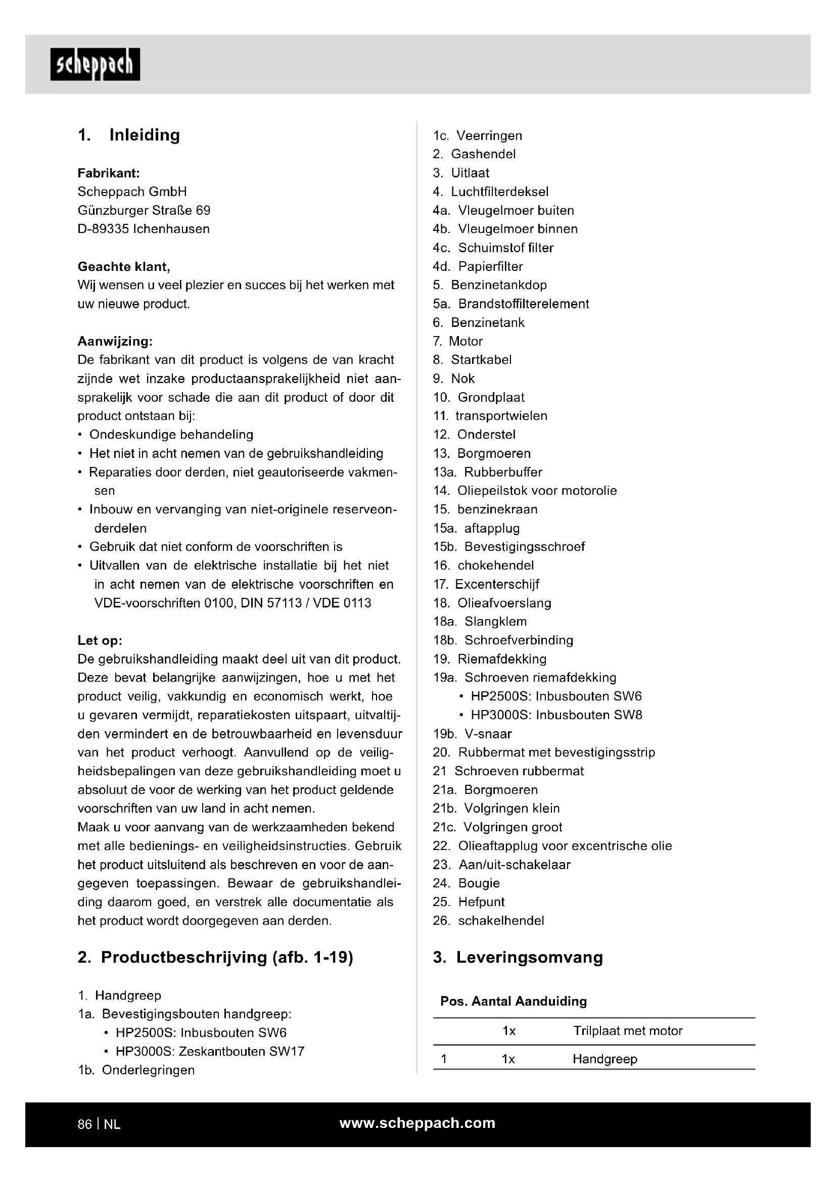 Fabrikant: Scheppach GmbH Günzburger Straße 69 D-89335 Ichenhausen Geachte klant, Wij wensen u veel plezier en succes bij het werken met uw nieuwe product. Aanwijzing: De fabrikant van dit product is volgens de van kracht zijnde wet inzake productaansprakelijkheid niet aan- sprakelijk voor schade die aan dit product of door dit product ontstaan bij: