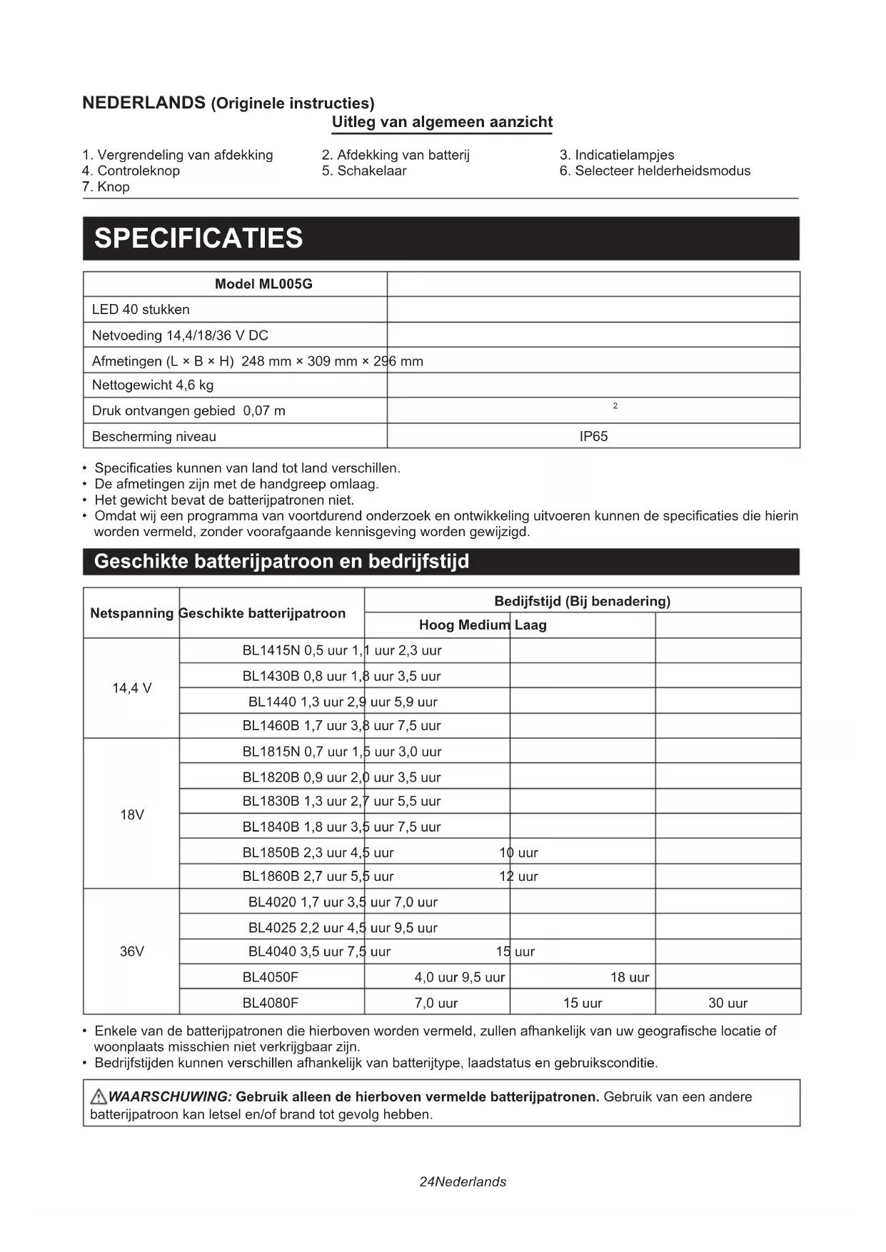 - Omdat wij een programma van voortdurend onderzoek en ontwikkeling uitvoeren kunnen de specificaties die hierin worden vermeld, zonder voorafgaande kennisgeving worden gewijzigd. Geschikte batterijpatroon en bedrijfstijd Netspanning Geschikte batterijpatroon Bedijfstijd (Bij benadering) Hoog Medium Laag 14,4 V BL1415N 0,5 uur 1,1 uur 2,3 uur BL1430B 0,8 uur 1,8 uur 3,5 uur BL1440 1,3 uur 2,9 uur 5,9 uur BL1460B 1,7 uur 3,8 uur 7,5 uur 18V BL1815N 0,7 uur 1,5 uur 3,0 uur BL1820B 0,9 uur 2,0 uur 3,5 uur BL1830B 1,3 uur 2,7 uur 5,5 uur BL1840B 1,8 uur 3,5 uur 7,5 uur BL1850B 2,3 uur 4,5 uur 10 uur BL1860B 2,7 uur 5,5 uur 12 uur 36V BL4020 1,7 uur 3,5 uur 7,0 uur BL4025 2,2 uur 4,5 uur 9,5 uur BL4040 3,5 uur 7,5 uur 15 uur BL4050F 4,0 uur 9,5 uur 18 uur BL4080F 7,0 uur 15 uur 30 uur