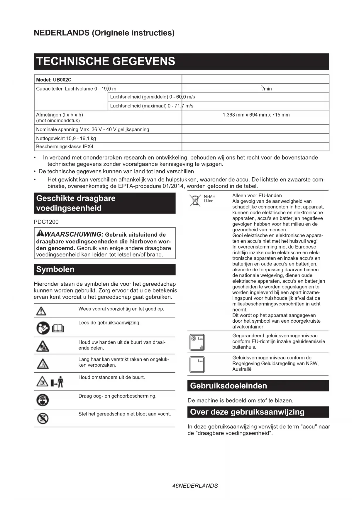 - Hetgewichtkanverschillenafhankelijkvandehulpstukken,waaronderdeaccu.Delichtsteenzwaarstecom- binatie,overeenkomstigdeEPTA-procedure01/2014,wordengetoondindetabel. Geschikte draagbare voedingseenheid PDC1200 WAARSCHUWING: Gebruik uitsluitend de draagbare voedingseenheden die hierboven wor- den genoemd.Gebruikvanenigeanderedraagbare voedingseenheidkanleidentotletselen/ofbrand. Symbolen Hieronderstaandesymbolendievoorhetgereedschap kunnenwordengebruikt.Zorgervoordatudebetekenis ervankentvoordatuhetgereedschapgaatgebruiken. Wees vooral voorzichtig en let goed op. Leesdegebruiksaanwijzing. Houduwhandenuitdebuurtvandraai- ende delen. Lang haar kan verstrikt raken en ongeluk- ken veroorzaken. Houdomstandersuitdebuurt. Draagoog-engehoorbescherming. Stelhetgereedschapnietblootaanvocht. Ni-MH Li-ion AlleenvoorEU-landen Als gevolg van de aanwezigheid van schadelijkecomponenteninhetapparaat, kunnen oude elektrische en elektronische apparaten,accu‘senbatterijennegatieve gevolgenhebbenvoorhetmilieuende gezondheid van mensen. Gooi elektrische en elektronische appara- ten en accu‘s niet met het huisvuil weg! InovereenstemmingmetdeEuropese richtlijninzakeoudeelektrischeenelek- tronische apparaten en inzake accu‘s en batterijenenoudeaccu‘senbatterijen, alsmededetoepassingdaarvanbinnen de nationale wetgeving, dienen oude elektrischeapparaten,accu‘senbatterijen gescheiden te worden opgeslagen en te wordeningeleverdbijeenapartinzame- lingspuntvoorhuishoudelijkafvaldatde milieubeschermingsvoorschrifteninacht neemt. Dit wordt op het apparaat aangegeven doorhetsymboolvaneendoorgekruiste afvalcontainer. Gegarandeerd geluidsvermogenniveau conformEU-richtlijninzakegeluidsemissie buitenhuis. Geluidsvermogenniveau conform de Regelgeving Geluidsregeling van NSW, Australië Gebruiksdoeleinden Demachineisbedoeldomstofteblazen. Over deze gebruiksaanwijzing Indezegebruiksaanwijzingverwijstdeterm"accu"naar de"draagbarevoedingseenheid".47 NEDERLANDS Geluidsniveau Detypische,A-gewogengeluidsniveauszijngemeten volgensEN50636-2-100: Geluidsdrukniveau (L