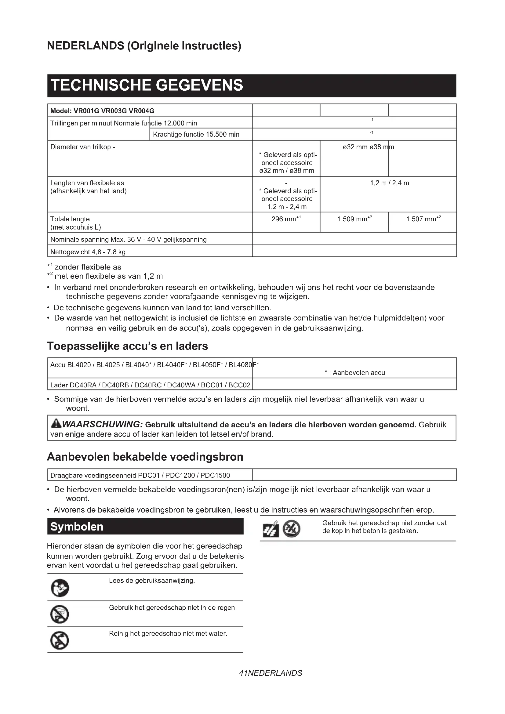 - Alvorens de bekabelde voedingsbron te gebruiken, leest u de instructies en waarschuwingsopschriften erop. Symbolen Hieronder staan de symbolen die voor het gereedschap kunnen worden gebruikt. Zorg ervoor dat u de betekenis ervan kent voordat u het gereedschap gaat gebruiken. Lees de gebruiksaanwijzing. Gebruik het gereedschap niet in de regen. Reinig het gereedschap niet met water. Gebruik het gereedschap niet zonder dat de kop in het beton is gestoken.42 NEDERLANDS Ni-MH Li-ion Alleen voor EU-landen Als gevolg van de aanwezigheid van schadelijke componenten in het apparaat, kunnen oude elektrische en elektronische apparaten, accu‘s en batterijen negatieve gevolgen hebben voor het milieu en de gezondheid van mensen. Gooi elektrische en elektronische appara- ten en accu‘s niet met het huisvuil weg! In overeenstemming met de Europese richtlijn inzake oude elektrische en elek- tronische apparaten en inzake accu‘s en batterijen en oude accu‘s en batterijen, alsmede de toepassing daarvan binnen de nationale wetgeving, dienen oude elektrische apparaten, accu‘s en batterijen gescheiden te worden opgeslagen en te worden ingeleverd bij een apart inzame- lingspunt voor huishoudelijk afval dat de milieubeschermingsvoorschriften in acht neemt. Dit wordt op het apparaat aangegeven door het symbool van een doorgekruiste afvalcontainer. Bedoeld gebruik Het gereedschap is bedoeld om tijdens het storten van beton de luchtbellen uit het beton te verwijderen. Geluidsniveau De typische, A-gewogen geluidsniveaus zijn gemeten volgens ENIEC62841-2-12: Model VR001G Geluidsdrukniveau (L