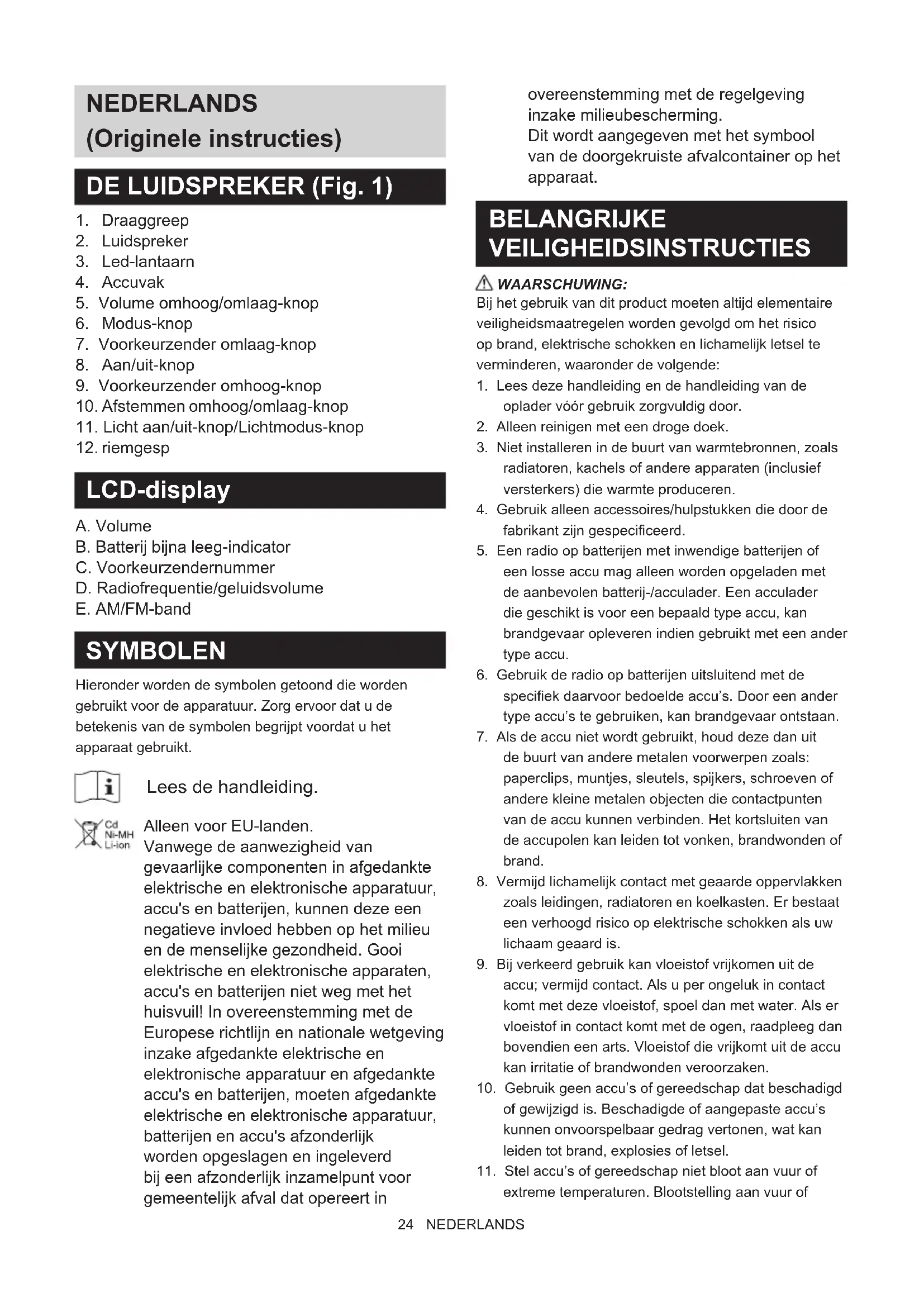 LCD-display A. Volume B. Batterij bijna leeg-indicator C. Voorkeurzendernummer D. Radiofrequentie/geluidsvolume E. AM/FM-band SYMBOLEN Hieronder worden de symbolen getoond die worden gebruikt voor de apparatuur. Zorg ervoor dat u de betekenis van de symbolen begrijpt voordat u het apparaat gebruikt. Lees de handleiding. Alleen voor EU-landen. Vanwege de aanwezigheid van gevaarlijke componenten in afgedankte elektrische en elektronische apparatuur, accu's en batterijen, kunnen deze een negatieve invloed hebben op het milieu en de menselijke gezondheid. Gooi elektrische en elektronische apparaten, accu's en batterijen niet weg met het huisvuil! In overeenstemming met de Europese richtlijn en nationale wetgeving inzake afgedankte elektrische en elektronische apparatuur en afgedankte accu's en batterijen, moeten afgedankte elektrische en elektronische apparatuur, batterijen en accu's afzonderlijk worden opgeslagen en ingeleverd bij een afzonderlijk inzamelpunt voor gemeentelijk afval dat opereert in overeenstemming met de regelgeving inzake milieubescherming. Dit wordt aangegeven met het symbool van de doorgekruiste afvalcontainer op het apparaat. BELANGRIJKE VEILIGHEIDSINSTRUCTIES WAARSCHUWING: Bij het gebruik van dit product moeten altijd elementaire veiligheidsmaatregelen worden gevolgd om het risico op brand, elektrische schokken en lichamelijk letsel te verminderen, waaronder de volgende: