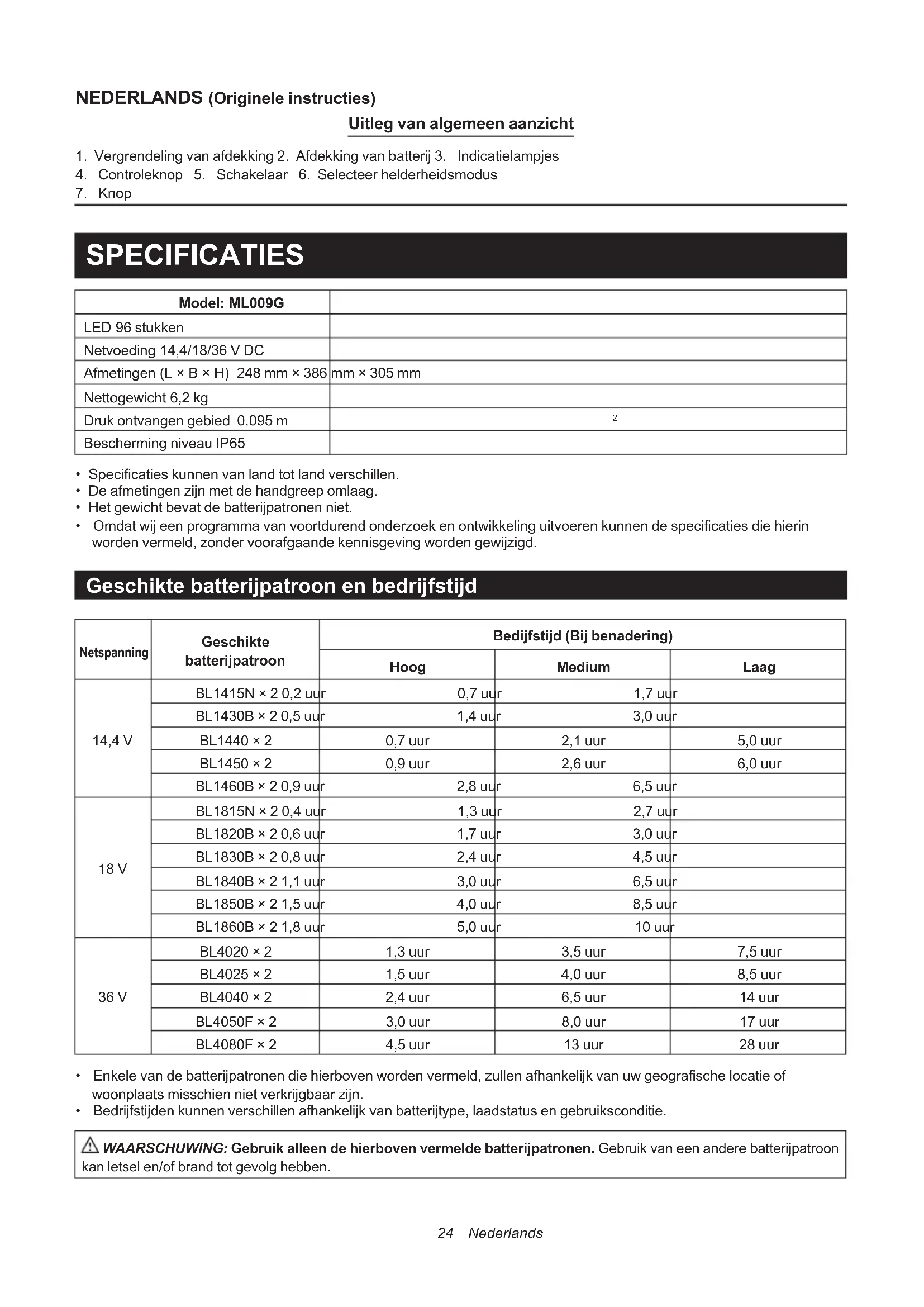 - Omdat wij een programma van voortdurend onderzoek en ontwikkeling uitvoeren kunnen de specificaties die hierin worden vermeld, zonder voorafgaande kennisgeving worden gewijzigd. Geschikte batterijpatroon en bedrijfstijd Netspanning Geschikte batterijpatroon Bedijfstijd (Bij benadering) Hoog Medium Laag 14,4 V BL1415N × 2 0,2 uur 0,7 uur 1,7 uur BL1430B × 2 0,5 uur 1,4 uur 3,0 uur BL1440 × 2 0,7 uur 2,1 uur 5,0 uur BL1450 × 2 0,9 uur 2,6 uur 6,0 uur BL1460B × 2 0,9 uur 2,8 uur 6,5 uur 18 V BL1815N × 2 0,4 uur 1,3 uur 2,7 uur BL1820B × 2 0,6 uur 1,7 uur 3,0 uur BL1830B × 2 0,8 uur 2,4 uur 4,5 uur BL1840B × 2 1,1 uur 3,0 uur 6,5 uur BL1850B × 2 1,5 uur 4,0 uur 8,5 uur BL1860B × 2 1,8 uur 5,0 uur 10 uur 36 V BL4020 × 2 1,3 uur 3,5 uur 7,5 uur BL4025 × 2 1,5 uur 4,0 uur 8,5 uur BL4040 × 2 2,4 uur 6,5 uur 14 uur BL4050F × 2 3,0 uur 8,0 uur 17 uur BL4080F × 2 4,5 uur 13 uur 28 uur