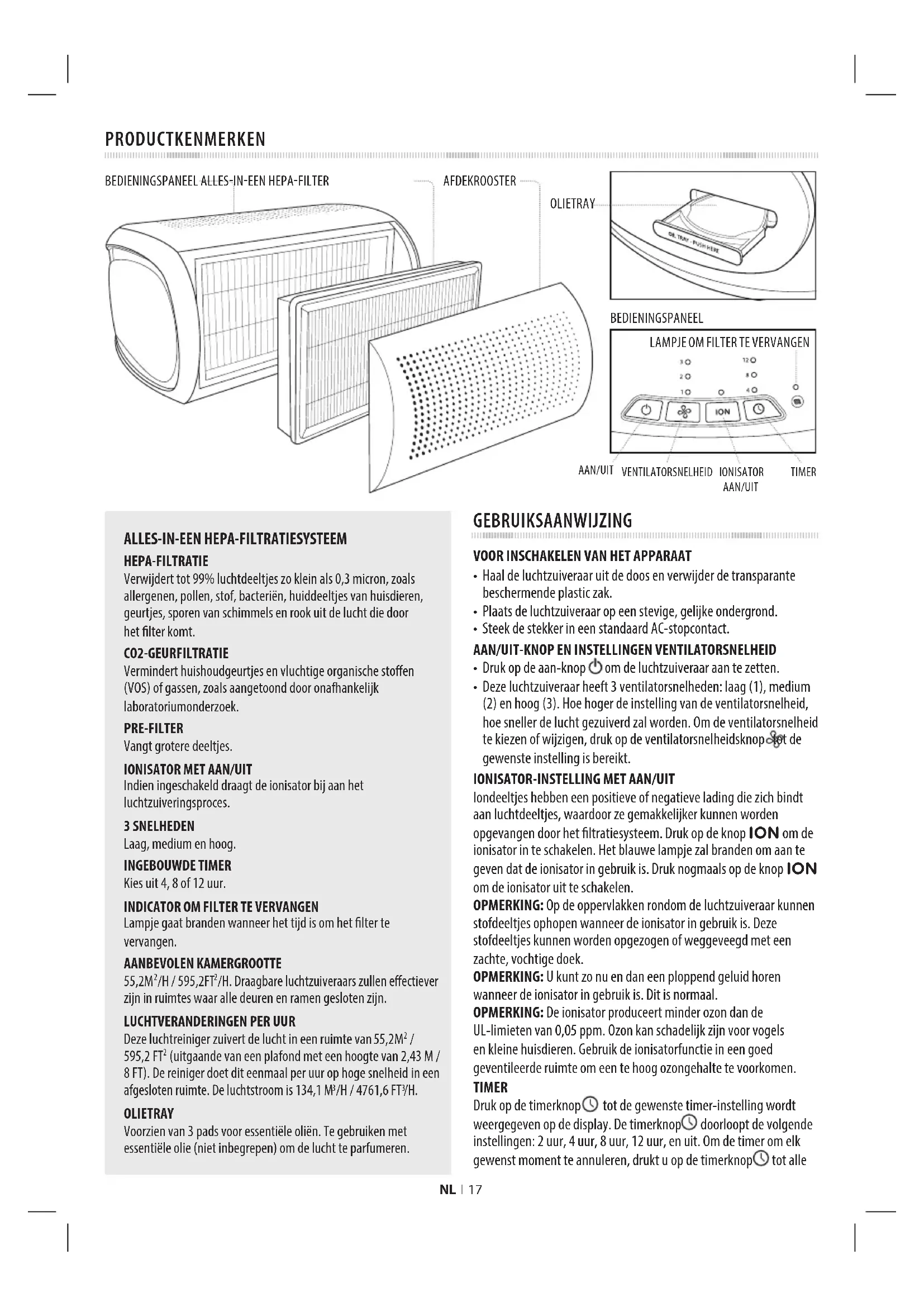 Iondeeltjes hebben een positieve of negatieve lading die zich bindt aan luchtdeeltjes, waardoor ze gemakkelijker kunnen worden opgevangen door het ltratiesysteem. Druk op de knop ION om de ionisator in te schakelen. Het blauwe lampje zal branden om aan te geven dat de ionisator in gebruik is. Druk nogmaals op de knop ION om de ionisator uit te schakelen. OPMERKING: Op de oppervlakken rondom de luchtzuiveraar kunnen stofdeeltjes ophopen wanneer de ionisator in gebruik is. Deze stofdeeltjes kunnen worden opgezogen of weggeveegd met een zachte, vochtige doek. OPMERKING: U kunt zo nu en dan een ploppend geluid horen wanneer de ionisator in gebruik is. Dit is normaal. OPMERKING: De ionisator produceert minder ozon dan de UL-limieten van 0,05 ppm. Ozon kan schadelijk zijn voor vogels en kleine huisdieren. Gebruik de ionisatorfunctie in een goed geventileerde ruimte om een te hoog ozongehalte te voorkomen. TIMER Druk op de timerknop tot de gewenste timer-instelling wordt weergegeven op de display. De timerknop doorloopt de volgende instellingen: 2 uur, 4 uur, 8 uur, 12 uur, en uit. Om de timer om elk gewenst moment te annuleren, drukt u op de timerknop tot alle ALLES-IN-EEN HEPA-FILTRATIESYSTEEM HEPA-FILTRATIE Verwijdert tot 99% luchtdeeltjes zo klein als 0,3 micron, zoals allergenen, pollen, stof, bacteriën, huiddeeltjes van huisdieren, geurtjes, sporen van schimmels en rook uit de lucht die door het lter komt. CO2-GEURFILTRATIE Vermindert huishoudgeurtjes en vluchtige organische stoen (VOS) of gassen, zoals aangetoond door onafhankelijk laboratoriumonderzoek. PRE-FILTER Vangt grotere deeltjes.