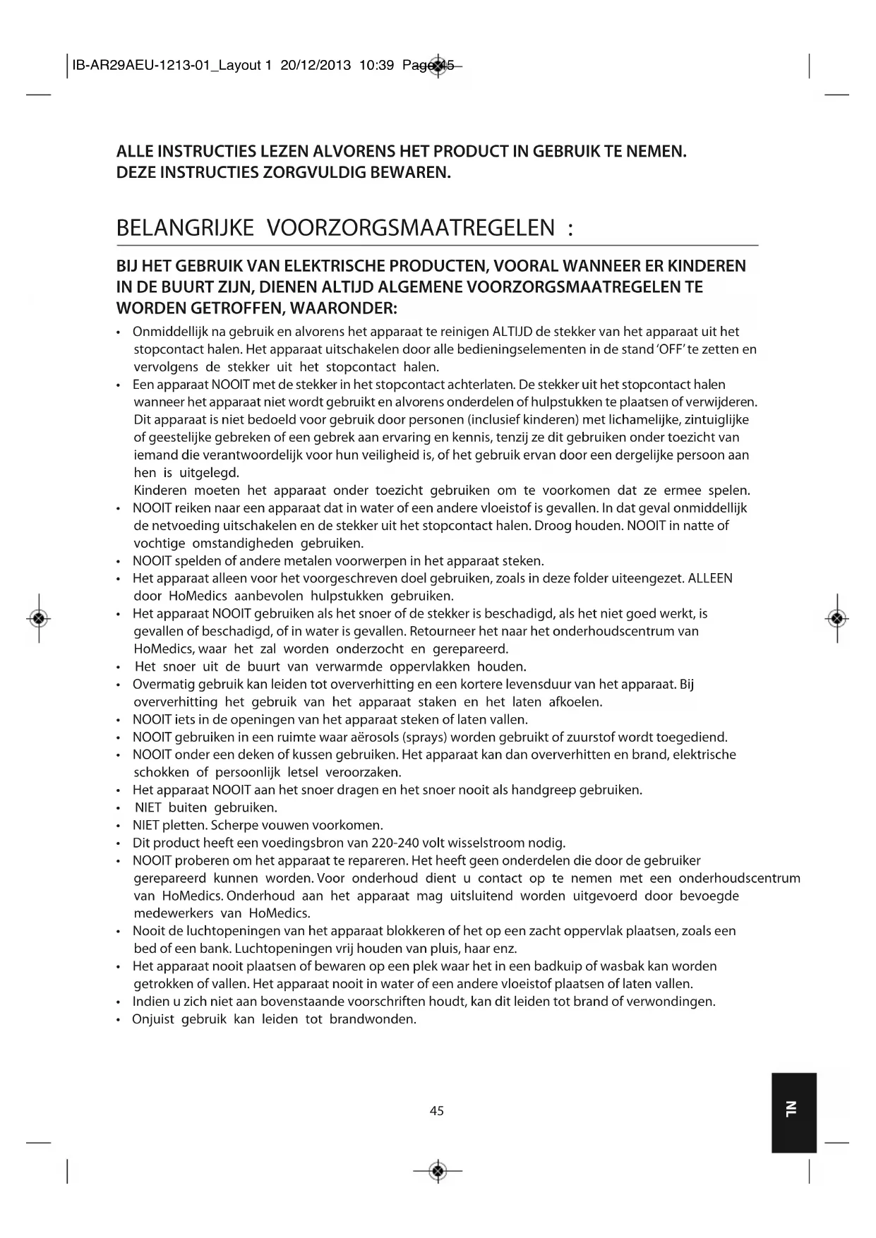 - Onjuist gebruik kan leiden tot brandwonden. IB-AR29AEU-1213-01_Layout 1 20/12/2013 10:39 Page 45VOORZORGSMAATREGELEN : DIT GEDEELTE AANDACHTIG LEZEN ALVORENS HET APPARAAT IN GEBRUIK TE NEMEN.