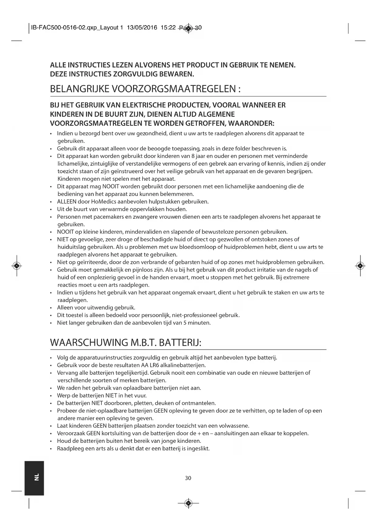 - Raadpleeg een arts als u denkt dat er een batterij is ingeslikt. IB-FAC500-0516-02.qxp_Layout 1 13/05/2016 15:22 Page 3031