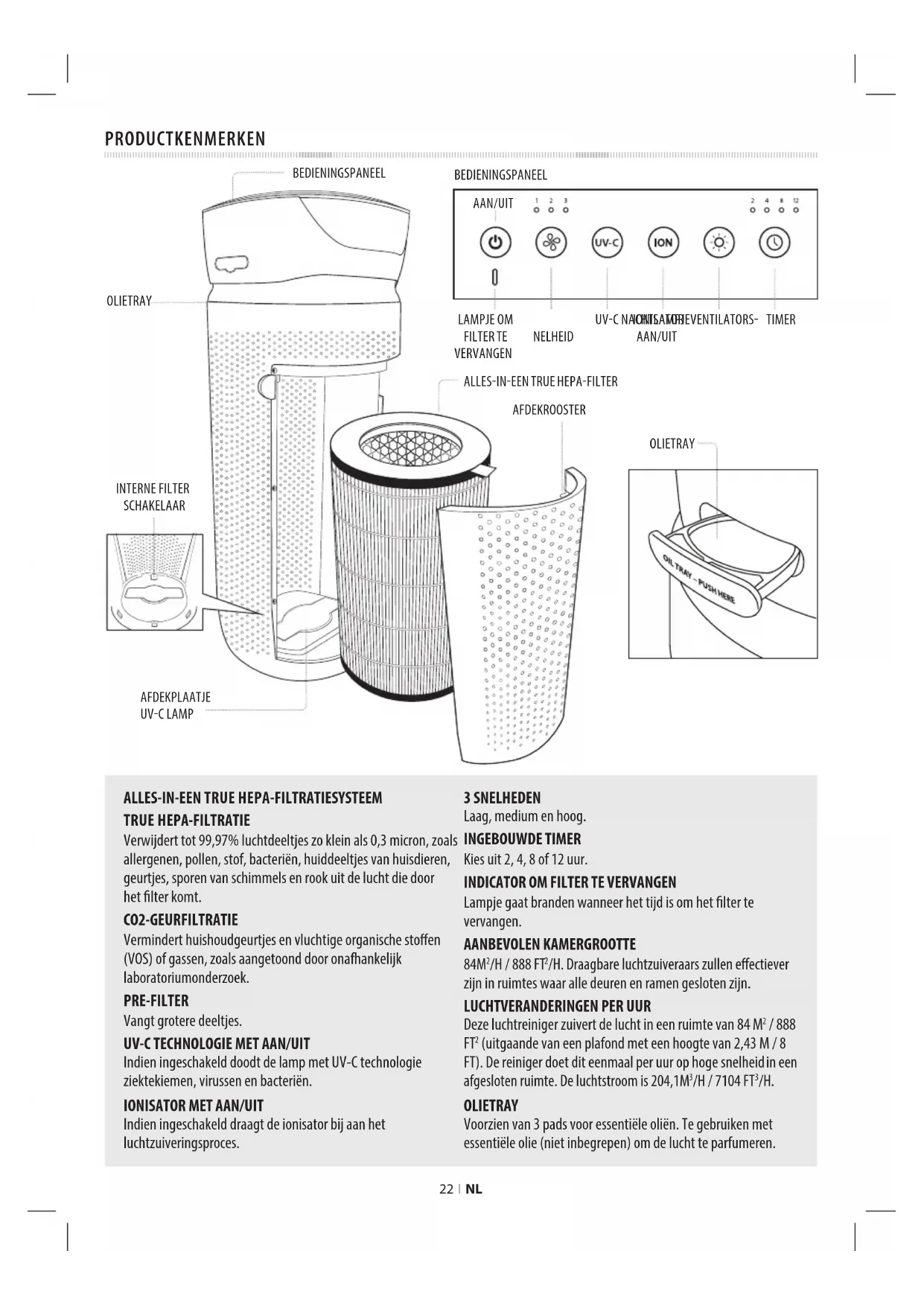 Indien ingeschakeld draagt de ionisator bij aan het luchtzuiveringsproces. 3 SNELHEDEN Laag, medium en hoog. INGEBOUWDE TIMER Kies uit 2, 4, 8 of 12 uur.