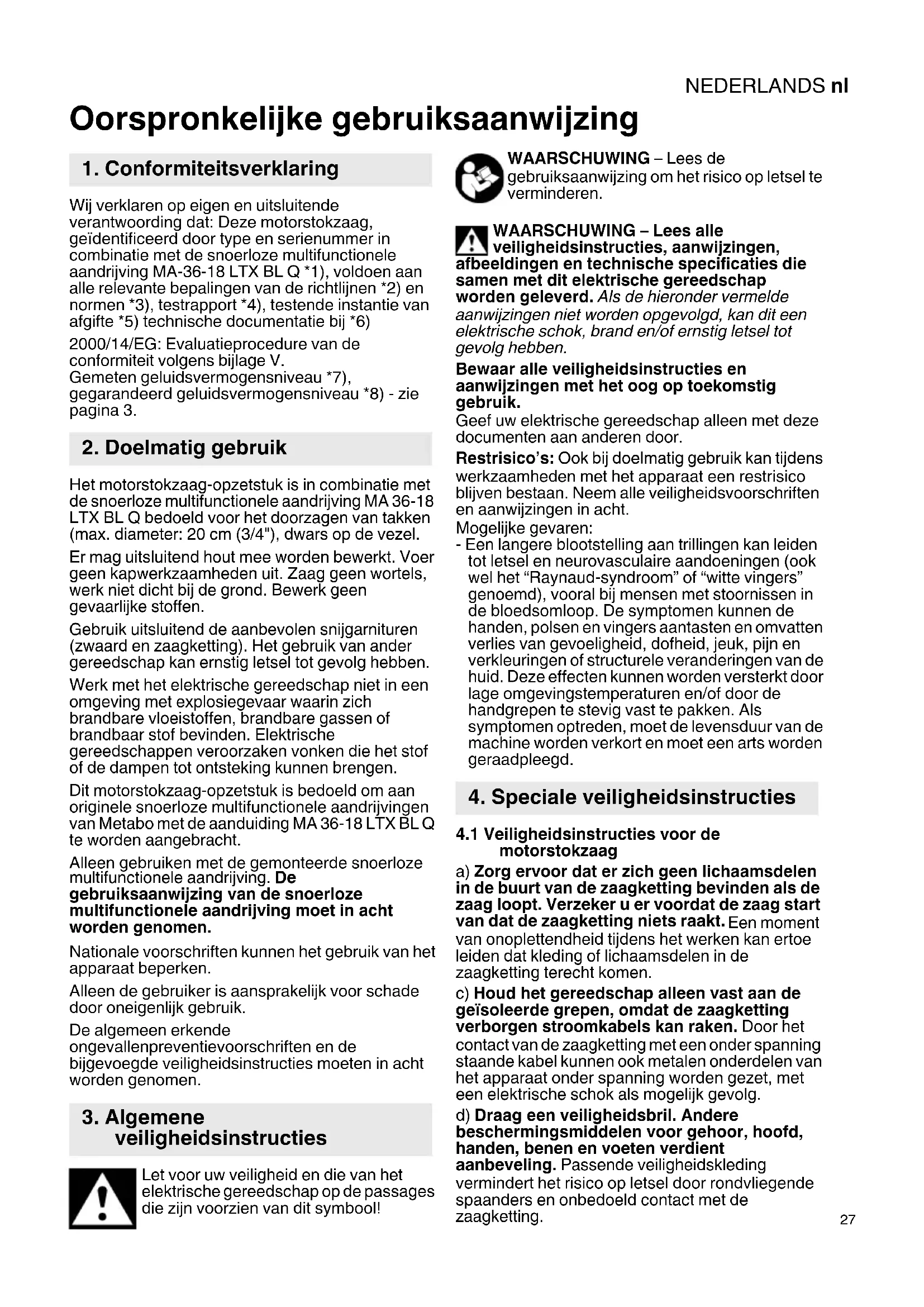 Oorspronkelijke gebruiksaanwijzing Wij verklaren op eigen en uitsluitende verantwoording dat: Deze motorstokzaag, geïdentificeerd door type en serienummer in combinatie met de snoerloze multifunctionele aandrijving MA-36-18 LTX BL Q *1), voldoen aan alle relevante bepalingen van de richtlijnen *2) en normen *3), testrapport *4), testende instantie van afgifte *5) technische documentatie bij *6) 2000/14/EG: Evaluatieprocedure van de conformiteit volgens bijlage V. Gemeten geluidsvermogensniveau *7), gegarandeerd geluidsvermogensniveau *8) - zie pagina 3. Het motorstokzaag-opzetstuk is in combinatie met de snoerloze multifunctionele aandrijving MA 36-18 LTX BL Q bedoeld voor het doorzagen van takken (max. diameter: 20 cm (3/4"), dwars op de vezel. Er mag uitsluitend hout mee worden bewerkt. Voer geen kapwerkzaamheden uit. Zaag geen wortels, werk niet dicht bij de grond. Bewerk geen gevaarlijke stoffen. Gebruik uitsluitend de aanbevolen snijgarnituren (zwaard en zaagketting). Het gebruik van ander gereedschap kan ernstig letsel tot gevolg hebben. Werk met het elektrische gereedschap niet in een omgeving met explosiegevaar waarin zich brandbare vloeistoffen, brandbare gassen of brandbaar stof bevinden. Elektrische gereedschappen veroorzaken vonken die het stof of de dampen tot ontsteking kunnen brengen. Dit motorstokzaag-opzetstuk is bedoeld om aan originele snoerloze multifunctionele aandrijvingen van Metabo met de aanduiding MA 36-18 LTX BL Q te worden aangebracht. Alleen gebruiken met de gemonteerde snoerloze multifunctionele aandrijving. De gebruiksaanwijzing van de snoerloze multifunctionele aandrijving moet in acht worden genomen. Nationale voorschriften kunnen het gebruik van het apparaat beperken. Alleen de gebruiker is aansprakelijk voor schade door oneigenlijk gebruik. De algemeen erkende ongevallenpreventievoorschriften en de bijgevoegde veiligheidsinstructies moeten in acht worden genomen. Let voor uw veiligheid en die van het elektrische gereedschap op de passages die zijn voorzien van dit symbool! WAARSCHUWING – Lees de gebruiksaanwijzing om het risico op letsel te verminderen. WAARSCHUWING – Lees alle veiligheidsinstructies, aanwijzingen, afbeeldingen en technische specificaties die samen met dit elektrische gereedschap worden geleverd. Als de hieronder vermelde aanwijzingen niet worden opgevolgd, kan dit een elektrische schok, brand en/of ernstig letsel tot gevolg hebben. Bewaar alle veiligheidsinstructies en aanwijzingen met het oog op toekomstig gebruik. Geef uw elektrische gereedschap alleen met deze documenten aan anderen door. Restrisico’s: Ook bij doelmatig gebruik kan tijdens werkzaamheden met het apparaat een restrisico blijven bestaan. Neem alle veiligheidsvoorschriften en aanwijzingen in acht. Mogelijke gevaren: - Een langere blootstelling aan trillingen kan leiden tot letsel en neurovasculaire aandoeningen (ook wel het “Raynaud-syndroom” of “witte vingers” genoemd), vooral bij mensen met stoornissen in de bloedsomloop. De symptomen kunnen de handen, polsen en vingers aantasten en omvatten verlies van gevoeligheid, dofheid, jeuk, pijn en verkleuringen of structurele veranderingen van de huid. Deze effecten kunnen worden versterkt door lage omgevingstemperaturen en/of door de handgrepen te stevig vast te pakken. Als symptomen optreden, moet de levensduur van de machine worden verkort en moet een arts worden geraadpleegd.