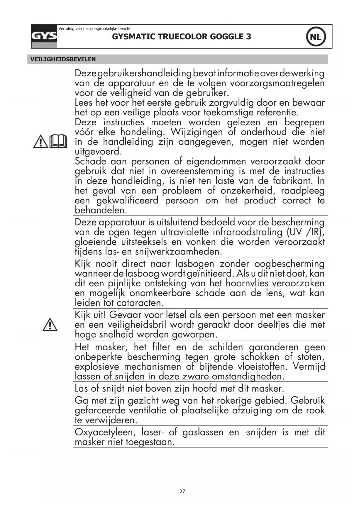 VEILIGHEIDSBEVELEN Deze gebruikershandleiding bevat informatie over de werking van de apparatuur en de te volgen voorzorgsmaatregelen voor de veiligheid van de gebruiker. Lees het voor het eerste gebruik zorgvuldig door en bewaar het op een veilige plaats voor toekomstige referentie. Deze instructies moeten worden gelezen en begrepen vóór elke handeling. Wijzigingen of onderhoud die niet in de handleiding zijn aangegeven, mogen niet worden uitgevoerd. Schade aan personen of eigendommen veroorzaakt door gebruik dat niet in overeenstemming is met de instructies in deze handleiding, is niet ten laste van de fabrikant. In het geval van een probleem of onzekerheid, raadpleeg een gekwalificeerd persoon om het product correct te behandelen. Deze apparatuur is uitsluitend bedoeld voor de bescherming van de ogen tegen ultraviolette infraroodstraling (UV /IR), gloeiende uitsteeksels en vonken die worden veroorzaakt tijdens las- en snijwerkzaamheden. Kijk nooit direct naar lasbogen zonder oogbescherming wanneer de lasboog wordt geïnitieerd. Als u dit niet doet, kan dit een pijnlijke ontsteking van het hoornvlies veroorzaken en mogelijk onomkeerbare schade aan de lens, wat kan leiden tot cataracten. Kijk uit! Gevaar voor letsel als een persoon met een masker en een veiligheidsbril wordt geraakt door deeltjes die met hoge snelheid worden geworpen. Het masker, het filter en de schilden garanderen geen onbeperkte bescherming tegen grote schokken of stoten, explosieve mechanismen of bijtende vloeistoffen. Vermijd lassen of snijden in deze zware omstandigheden. Las of snijdt niet boven zijn hoofd met dit masker. Ga met zijn gezicht weg van het rokerige gebied. Gebruik geforceerde ventilatie of plaatselijke afzuiging om de rook te verwijderen. Oxyacetyleen, laser- of gaslassen en -snijden is met dit masker niet toegestaan.GYSMATIC TRUECOLOR GOGGLE 3