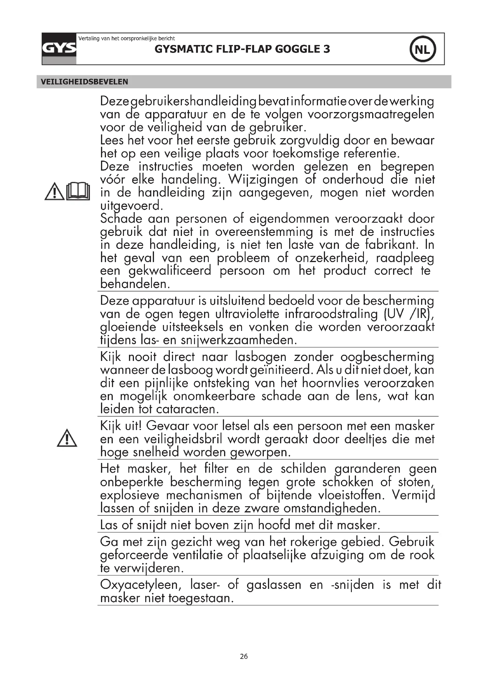 VEILIGHEIDSBEVELEN Deze gebruikershandleiding bevat informatie over de werking van de apparatuur en de te volgen voorzorgsmaatregelen voor de veiligheid van de gebruiker. Lees het voor het eerste gebruik zorgvuldig door en bewaar het op een veilige plaats voor toekomstige referentie. Deze instructies moeten worden gelezen en begrepen vóór elke handeling. Wijzigingen of onderhoud die niet in de handleiding zijn aangegeven, mogen niet worden uitgevoerd. Schade aan personen of eigendommen veroorzaakt door gebruik dat niet in overeenstemming is met de instructies in deze handleiding, is niet ten laste van de fabrikant. In het geval van een probleem of onzekerheid, raadpleeg een gekwaliceerd persoon om het product correct te behandelen. Deze apparatuur is uitsluitend bedoeld voor de bescherming van de ogen tegen ultraviolette infraroodstraling (UV /IR), gloeiende uitsteeksels en vonken die worden veroorzaakt tijdens las- en snijwerkzaamheden. Kijk nooit direct naar lasbogen zonder oogbescherming wanneer de lasboog wordt geïnitieerd. Als u dit niet doet, kan dit een pijnlijke ontsteking van het hoornvlies veroorzaken en mogelijk onomkeerbare schade aan de lens, wat kan leiden tot cataracten. Kijk uit! Gevaar voor letsel als een persoon met een masker en een veiligheidsbril wordt geraakt door deeltjes die met hoge snelheid worden geworpen. Het masker, het lter en de schilden garanderen geen onbeperkte bescherming tegen grote schokken of stoten, explosieve mechanismen of bijtende vloeistoffen. Vermijd lassen of snijden in deze zware omstandigheden. Las of snijdt niet boven zijn hoofd met dit masker. Ga met zijn gezicht weg van het rokerige gebied. Gebruik geforceerde ventilatie of plaatselijke afzuiging om de rook te verwijderen. Oxyacetyleen, laser- of gaslassen en -snijden is met dit masker niet toegestaan.GYSMATIC FLIP-FLAP GOGGLE 3