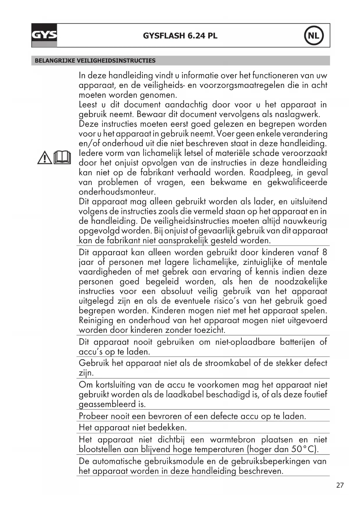 BELANGRIJKE VEILIGHEIDSINSTRUCTIES In deze handleiding vindt u informatie over het functioneren van uw apparaat, en de veiligheids- en voorzorgsmaatregelen die in acht moeten worden genomen. Leest u dit document aandachtig door voor u het apparaat in gebruik neemt. Bewaar dit document vervolgens als naslagwerk. Deze instructies moeten eerst goed gelezen en begrepen worden voor u het apparaat in gebruik neemt. Voer geen enkele verandering en/of onderhoud uit die niet beschreven staat in deze handleiding. Iedere vorm van lichamelijk letsel of materiële schade veroorzaakt door het onjuist opvolgen van de instructies in deze handleiding kan niet op de fabrikant verhaald worden. Raadpleeg, in geval van problemen of vragen, een bekwame en gekwalificeerde onderhoudsmonteur. Dit apparaat mag alleen gebruikt worden als lader, en uitsluitend volgens de instructies zoals die vermeld staan op het apparaat en in de handleiding. De veiligheidsinstructies moeten altijd nauwkeurig opgevolgd worden. Bij onjuist of gevaarlijk gebruik van dit apparaat kan de fabrikant niet aansprakelijk gesteld worden. Dit apparaat kan alleen worden gebruikt door kinderen vanaf 8 jaar of personen met lagere lichamelijke, zintuiglijke of mentale vaardigheden of met gebrek aan ervaring of kennis indien deze personen goed begeleid worden, als hen de noodzakelijke instructies voor een absoluut veilig gebruik van het apparaat uitgelegd zijn en als de eventuele risico’s van het gebruik goed begrepen worden. Kinderen mogen niet met het apparaat spelen. Reiniging en onderhoud van het apparaat mogen niet uitgevoerd worden door kinderen zonder toezicht. Dit apparaat nooit gebruiken om niet-oplaadbare batterijen of accu’s op te laden. Gebruik het apparaat niet als de stroomkabel of de stekker defect zijn. Om kortsluiting van de accu te voorkomen mag het apparaat niet gebruikt worden als de laadkabel beschadigd is, of als deze foutief geassembleerd is. Probeer nooit een bevroren of een defecte accu op te laden. Het apparaat niet bedekken. Het apparaat niet dichtbij een warmtebron plaatsen en niet blootstellen aan blijvend hoge temperaturen (hoger dan 50°C). De automatische gebruiksmodule en de gebruiksbeperkingen van het apparaat worden in deze handleiding beschreven.28 GYSFLASH 6.24 PL