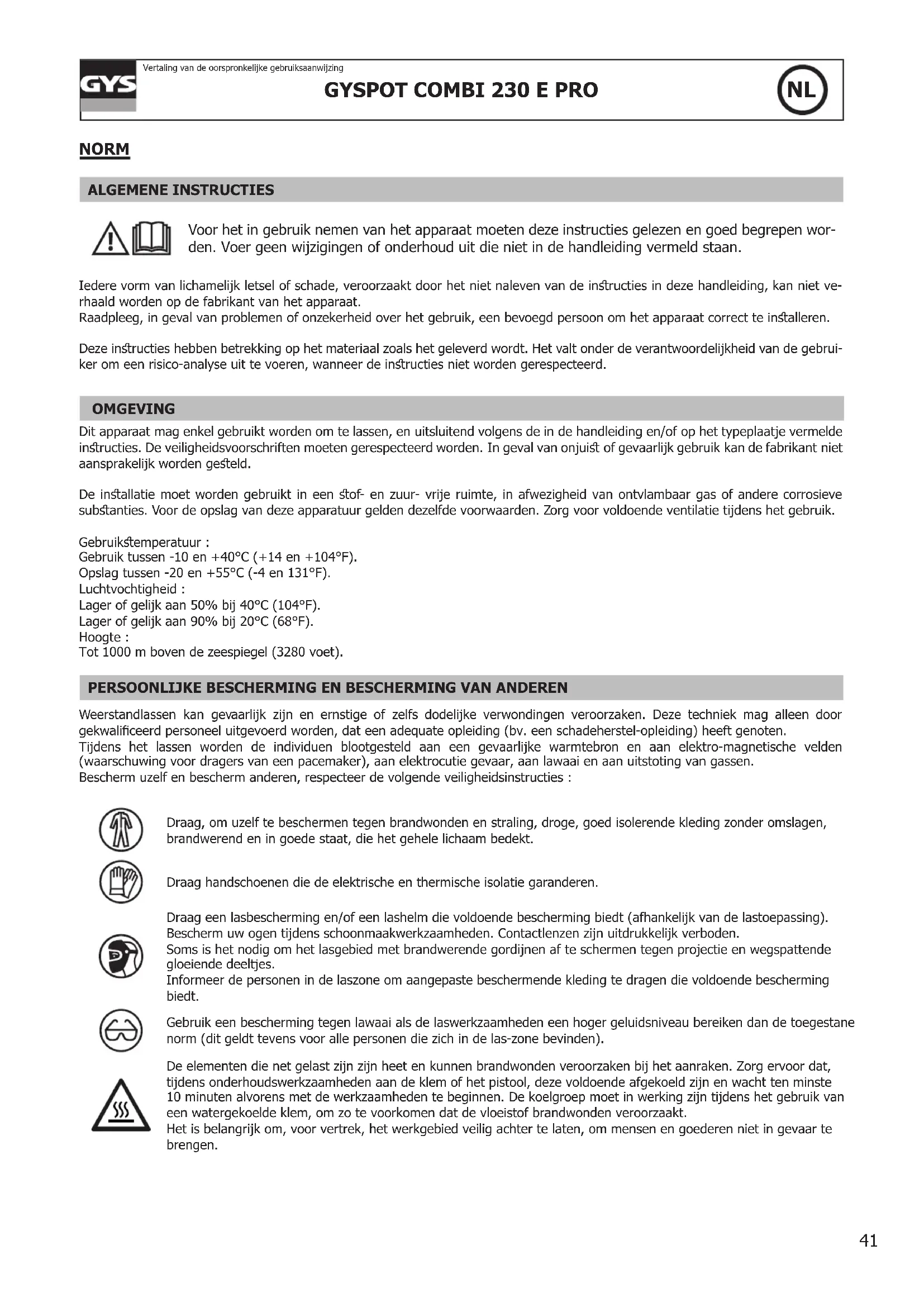 NORM ALGEMENE INSTRUCTIES Voor het in gebruik nemen van het apparaat moeten deze instructies gelezen en goed begrepen wor- den. Voer geen wijzigingen of onderhoud uit die niet in de handleiding vermeld staan. Iedere vorm van lichamelijk letsel of schade, veroorzaakt door het niet naleven van de inructies in deze handleiding, kan niet ve- rhaald worden op de fabrikant van het apparaat. Raadpleeg, in geval van problemen of onzekerheid over het gebruik, een bevoegd persoon om het apparaat correct te inalleren. Deze inructies hebben betrekking op het materiaal zoals het geleverd wordt. Het valt onder de verantwoordelijkheid van de gebrui- ker om een risico-analyse uit te voeren, wanneer de inructies niet worden gerespecteerd. OMGEVING Dit apparaat mag enkel gebruikt worden om te lassen, en uitsluitend volgens de in de handleiding en/of op het typeplaatje vermelde inructies. De veiligheidsvoorschriften moeten gerespecteerd worden. In geval van onjui of gevaarlijk gebruik kan de fabrikant niet aansprakelijk worden geeld. De inallatie moet worden gebruikt in een of- en zuur- vrije ruimte, in afwezigheid van ontvlambaar gas of andere corrosieve subanties. Voor de opslag van deze apparatuur gelden dezelfde voorwaarden. Zorg voor voldoende ventilatie tijdens het gebruik. Gebruikemperatuur :Gebruik tussen -10 en +40°C (+14 en +104°F).Opslag tussen -20 en +55°C (-4 en 131°F).Luchtvochtigheid :Lager of gelijk aan 50% bij 40°C (104°F).Lager of gelijk aan 90% bij 20°C (68°F).Hoogte : Tot 1000 m boven de zeespiegel (3280 voet).