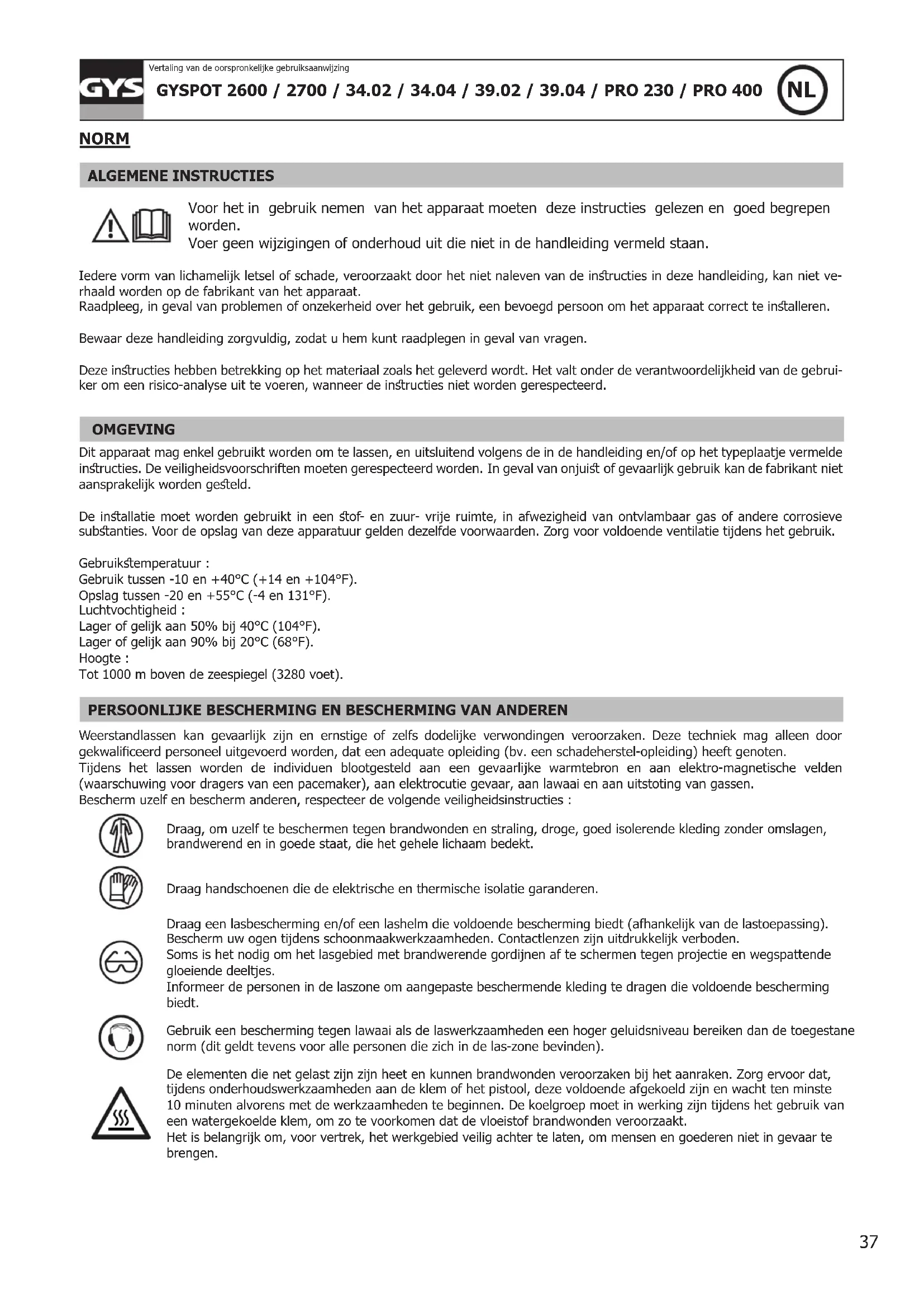 - GYSPOT 2600 / 2700 / 34.02 / 39.02 / Pro 230 : Dit materiaal worden geleverd met een 16 A aansluiting type CEE7/7, en mag alleen gebruikt worden in combinatie met een 230 V enkelfase elektrische installmentie (50 - 60 Hz) met drie kabels waarvan een neutrale geleider. ((Zmax 39.02 / 34.02) = 0.84Ω) & (Zmax 2600 / 2700) = 0.77Ω))