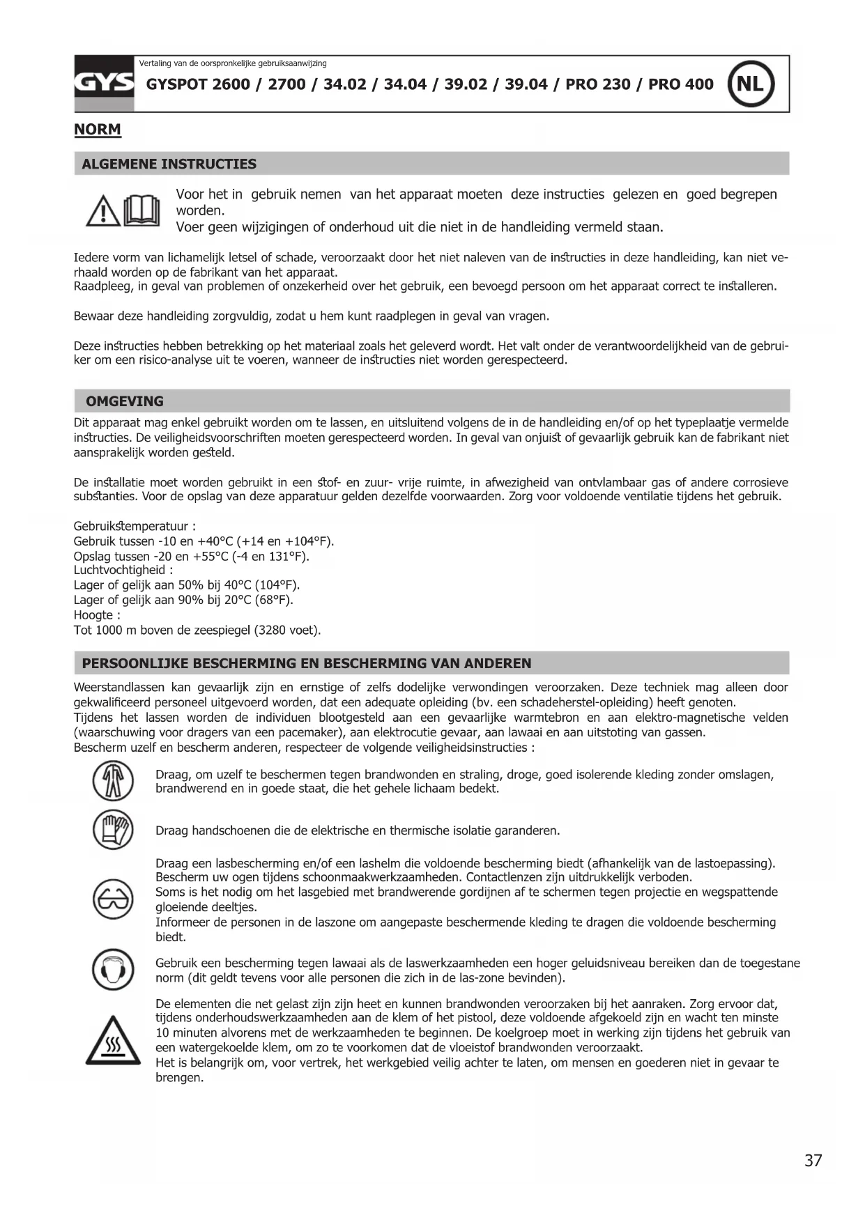 NORM ALGEMENE INSTRUCTIES Voor het in gebruik nemen van het apparaat moeten deze instructies gelezen en goed begrepen worden. Voer geen wijzigingen of onderhoud uit die niet in de handleiding vermeld staan. Iedere vorm van lichamelijk letsel of schade, veroorzaakt door het niet naleven van de inructies in deze handleiding, kan niet ve- rhaald worden op de fabrikant van het apparaat. Raadpleeg, in geval van problemen of onzekerheid over het gebruik, een bevoegd persoon om het apparaat correct te inalleren. Bewaar deze handleiding zorgvuldig, zodat u hem kunt raadplegen in geval van vragen. Deze inructies hebben betrekking op het materiaal zoals het geleverd wordt. Het valt onder de verantwoordelijkheid van de gebrui- ker om een risico-analyse uit te voeren, wanneer de inructies niet worden gerespecteerd. OMGEVING Dit apparaat mag enkel gebruikt worden om te lassen, en uitsluitend volgens de in de handleiding en/of op het typeplaatje vermelde inructies. De veiligheidsvoorschriften moeten gerespecteerd worden. In geval van onjui of gevaarlijk gebruik kan de fabrikant niet aansprakelijk worden geeld. De inallatie moet worden gebruikt in een of- en zuur- vrije ruimte, in afwezigheid van ontvlambaar gas of andere corrosieve subanties. Voor de opslag van deze apparatuur gelden dezelfde voorwaarden. Zorg voor voldoende ventilatie tijdens het gebruik. Gebruikemperatuur : Gebruik tussen -10 en +40°C (+14 en +104°F). Opslag tussen -20 en +55°C (-4 en 131°F). Luchtvochtigheid : Lager of gelijk aan 50% bij 40°C (104°F). Lager of gelijk aan 90% bij 20°C (68°F). Hoogte : Tot 1000 m boven de zeespiegel (3280 voet).