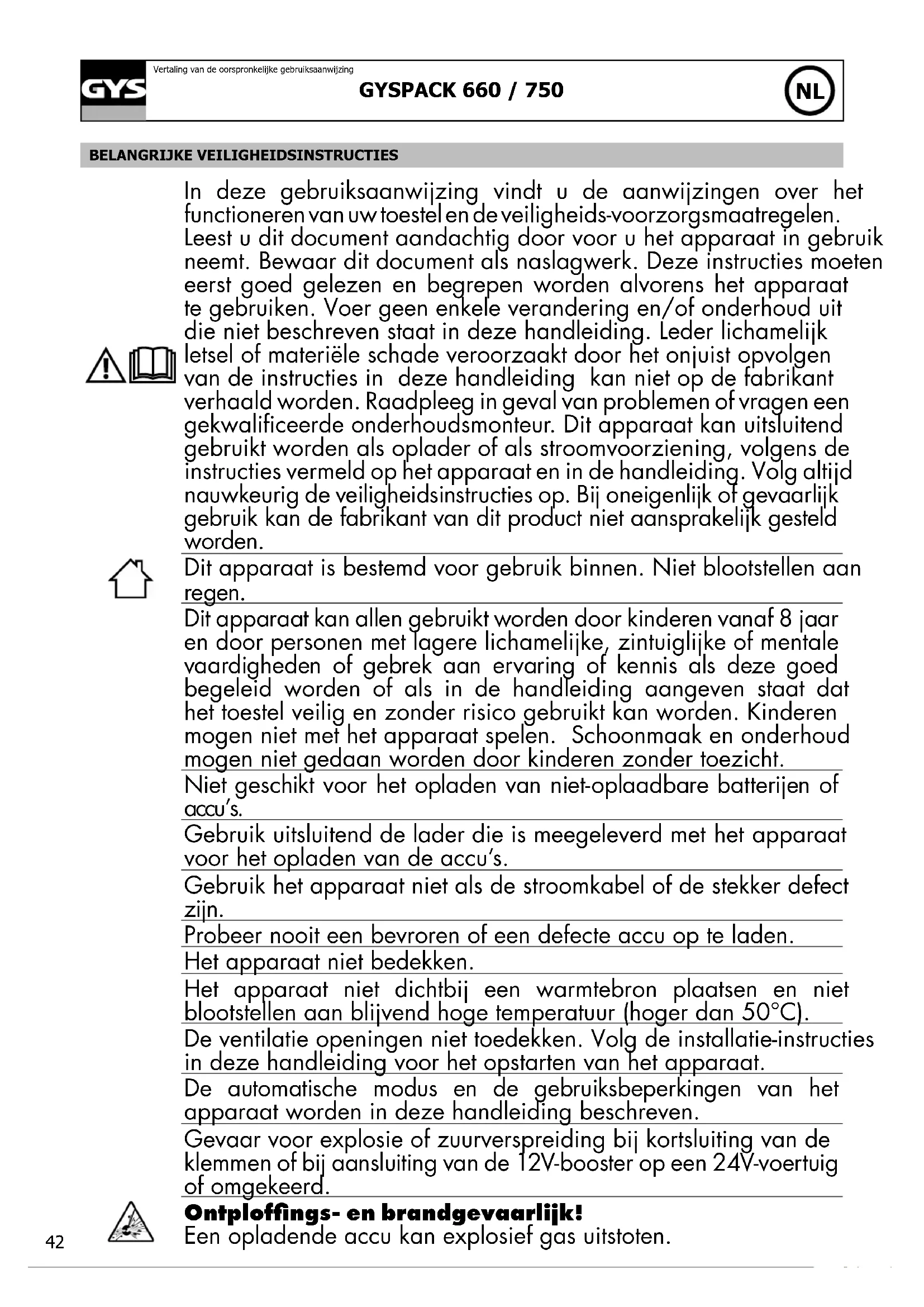 Vertaling van de oorspronkelijke gebruiksaanwijzing BELANGRIJKE VEILIGHEIDSINSTRUCTIES In deze gebruiksaanwijzing vindt u de aanwijzingen over het functioneren van uw toestel en de veiligheids-voorzorgsmaatregelen. Leest u dit document aandachtig door voor u het apparaat in gebruik neemt. Bewaar dit document als naslagwerk. Deze instructies moeten eerst goed gelezen en begrepen worden alvorens het apparaat te gebruiken. Voer geen enkele verandering en/of onderhoud uit die niet beschreven staat in deze handleiding. Leder lichamelijk letsel of materiële schade veroorzaakt door het onjuist opvolgen van de instructies in deze handleiding kan niet op de fabrikant verhaald worden. Raadpleeg in geval van problemen of vragen een gekwaliceerde onderhoudsmonteur. Dit apparaat kan uitsluitend gebruikt worden als oplader of als stroomvoorziening, volgens de instructies vermeld op het apparaat en in de handleiding. Volg altijd nauwkeurig de veiligheidsinstructies op. Bij oneigenlijk of gevaarlijk gebruik kan de fabrikant van dit product niet aansprakelijk gesteld worden. Dit apparaat is bestemd voor gebruik binnen. Niet blootstellen aan regen. Dit apparaat kan allen gebruikt worden door kinderen vanaf 8 jaar en door personen met lagere lichamelijke, zintuiglijke of mentale vaardigheden of gebrek aan ervaring of kennis als deze goed begeleid worden of als in de handleiding aangeven staat dat het toestel veilig en zonder risico gebruikt kan worden. Kinderen mogen niet met het apparaat spelen. Schoonmaak en onderhoud mogen niet gedaan worden door kinderen zonder toezicht. Niet geschikt voor het opladen van niet-oplaadbare batterijen of accu’s. Gebruik uitsluitend de lader die is meegeleverd met het apparaat voor het opladen van de accu’s. Gebruik het apparaat niet als de stroomkabel of de stekker defect zijn. Probeer nooit een bevroren of een defecte accu op te laden. Het apparaat niet bedekken. Het apparaat niet dichtbij een warmtebron plaatsen en niet blootstellen aan blijvend hoge temperatuur (hoger dan 50°C). De ventilatie openingen niet toedekken. Volg de installatie-instructies in deze handleiding voor het opstarten van het apparaat. De automatische modus en de gebruiksbeperkingen van het apparaat worden in deze handleiding beschreven. Gevaar voor explosie of zuurverspreiding bij kortsluiting van de klemmen of bij aansluiting van de 12V-booster op een 24V-voertuig of omgekeerd. Ontploffings- en brandgevaarlijk! Een opladende accu kan explosief gas uitstoten.43 GYSPACK 660 / 750