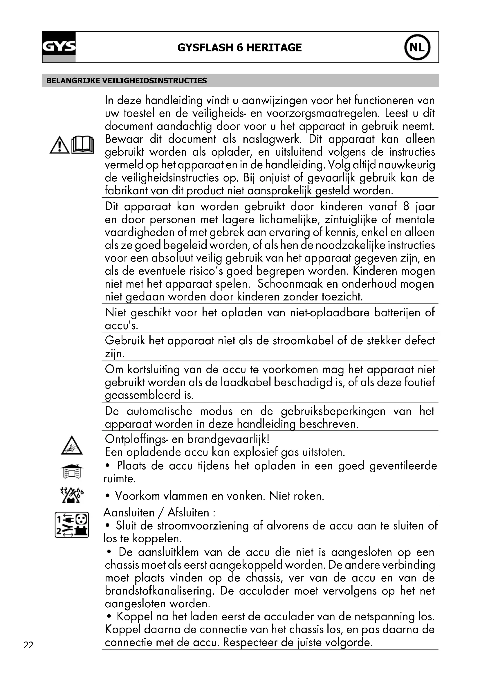 - Afzonderlijke inzameling vereist. Niet met het huishoudelijke afval wegwerpen. ALGEMENE BESCHRIJVING Uw Gysash is speciaal ontworpen voor het opladen van de meeste lood-accu’s, met onderhoud of onderhoudsvrij, die gebruikt worden in auto’s en in veel andere voertuigen. Dit kunnen verschillende types accu’s zijn, bijvoorbeeld : GEL (gegeleerde elektro- lyt), AGM (geïmpregneerde elektrolyt), WET, MF (Maintenance Free) CA (Calcium)......De GYSFLASH 6 HERITAGE is perfect geschikt voor het opladen van :- 6V accu’s (3 elementen van 2V) van 1,2 Ah tot 125 Ah en tot 170 Ah voor het druppel-laden- 12V accu’s (6 elementen van 2V) van 1,2 Ah tot 125 Ah en tot 170 Ah voor het druppel-laden. OPSTARTEN 1. Sluit de accu-lader aan op de accu met behulp van de gekozen hulpmiddelen (klemmen, kabelschoenen enz.). 2. Sluit de acculader aan op een stopcontact (enkel fase netwerk, 220-240Vac 50-60 Hz). 3. Kies de module met een druk op knop . Het opladen start automatisch na ongeveer vijf seconden.4. Tijdens het opladen geeft het apparaat het laadniveau aan. Wanneer het lampje knippert, is de accu gereed om de motor op te starten. En wanneer het lampje blijft branden is de accu volledig opgeladen. 5. Het laden kan op ieder gewenst moment onderbroken worden, door de stekker uit het stopcontact te halen of door op knop te drukken. 6. Koppel, na aoop van het laadproces, eerst de acculader van de netspanning af. Koppel daarna de aansluitingen van de accu los. LAAD MODULES