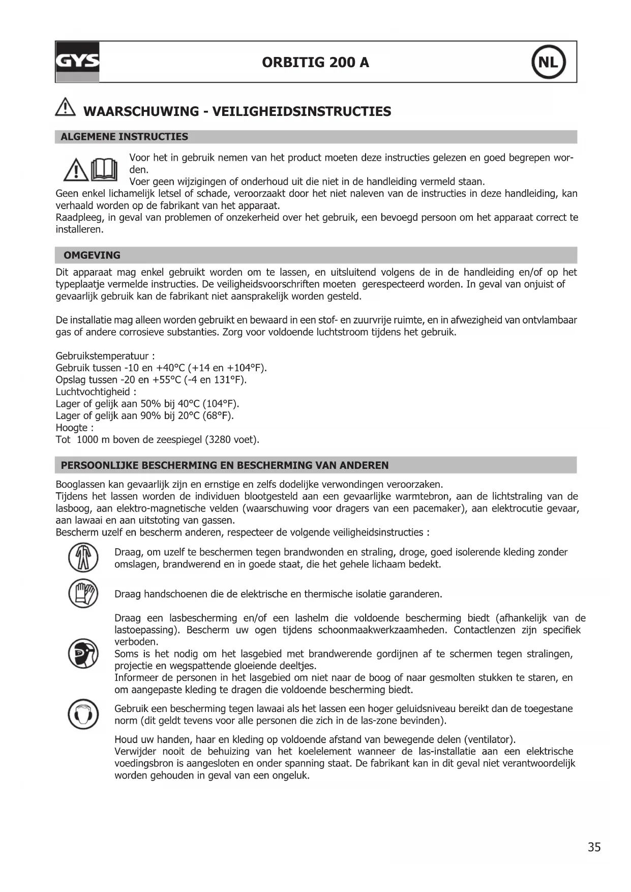 Booglassen kan gevaarlijk zijn en ernstige en zelfs dodelijke verwondingen veroorzaken. Tijdens het lassen worden de individuen blootgesteld aan een gevaarlijke warmtebron, aan de lichtstraling van de lasboog, aan elektro-magnetische velden (waarschuwing voor dragers van een pacemaker), aan elektrocutie gevaar, aan lawaai en aan uitstoting van gassen. Bescherm uzelf en bescherm anderen, respecteer de volgende veiligheidsinstructies : Draag, om uzelf te beschermen tegen brandwonden en straling, droge, goed isolerende kleding zonder omslagen, brandwerend en in goede staat, die het gehele lichaam bedekt. Draag handschoenen die de elektrische en thermische isolatie garanderen. Draag een lasbescherming en/of een lashelm die voldoende bescherming biedt (afhankelijk van de lastoepassing). Bescherm uw ogen tijdens schoonmaakwerkzaamheden. Contactlenzen zijn speciek verboden. Soms is het nodig om het lasgebied met brandwerende gordijnen af te schermen tegen stralingen, projectie en wegspattende gloeiende deeltjes. Informeer de personen in het lasgebied om niet naar de boog of naar gesmolten stukken te staren, en om aangepaste kleding te dragen die voldoende bescherming biedt. Gebruik een bescherming tegen lawaai als het lassen een hoger geluidsniveau bereikt dan de toegestane norm (dit geldt tevens voor alle personen die zich in de las-zone bevinden). Houd uw handen, haar en kleding op voldoende afstand van bewegende delen (ventilator). Verwijder nooit de behuizing van het koelelement wanneer de las-installatie aan een elektrische voedingsbron is aangesloten en onder spanning staat. De fabrikant kan in dit geval niet verantwoordelijk worden gehouden in geval van een ongeluk.36 ORBITIG 200 A