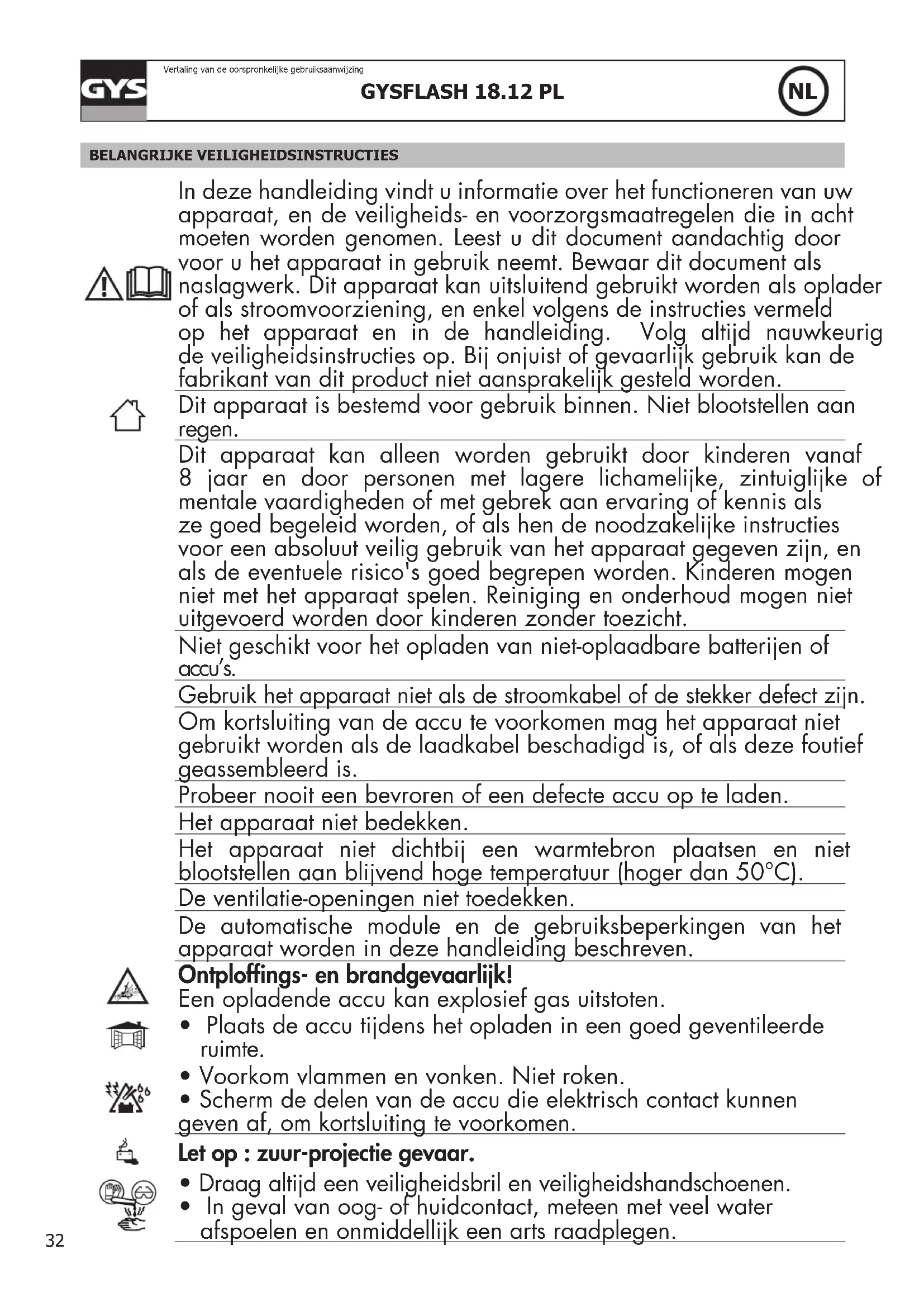 - Beveiligingen : De GYSFLASH 18.12 PL beschikt over een reeks van beveiligingen tegen kortsluiting en ompoling. Het apparaat beschikt over een systeem dat vonkvorming tijdens het aankoppelen van de acculader op de accu voorkomt. De lader heeft een dubbele isolatie en is compatibel met auto-elektronica. De GYSFLASH 18.12 PL is uitgerust met een geïntegreerde temperatuur-sensor, die het apparaat in staat stelt om de laadstroom aan te passen aan de omgevingstemperatuur, om zodoende oververhitting van de interne elektronica te voorkomen. NL37 GYSFLASH 18.12 PL Vertaling van de oorspronkelijke gebruiksaanwijzing