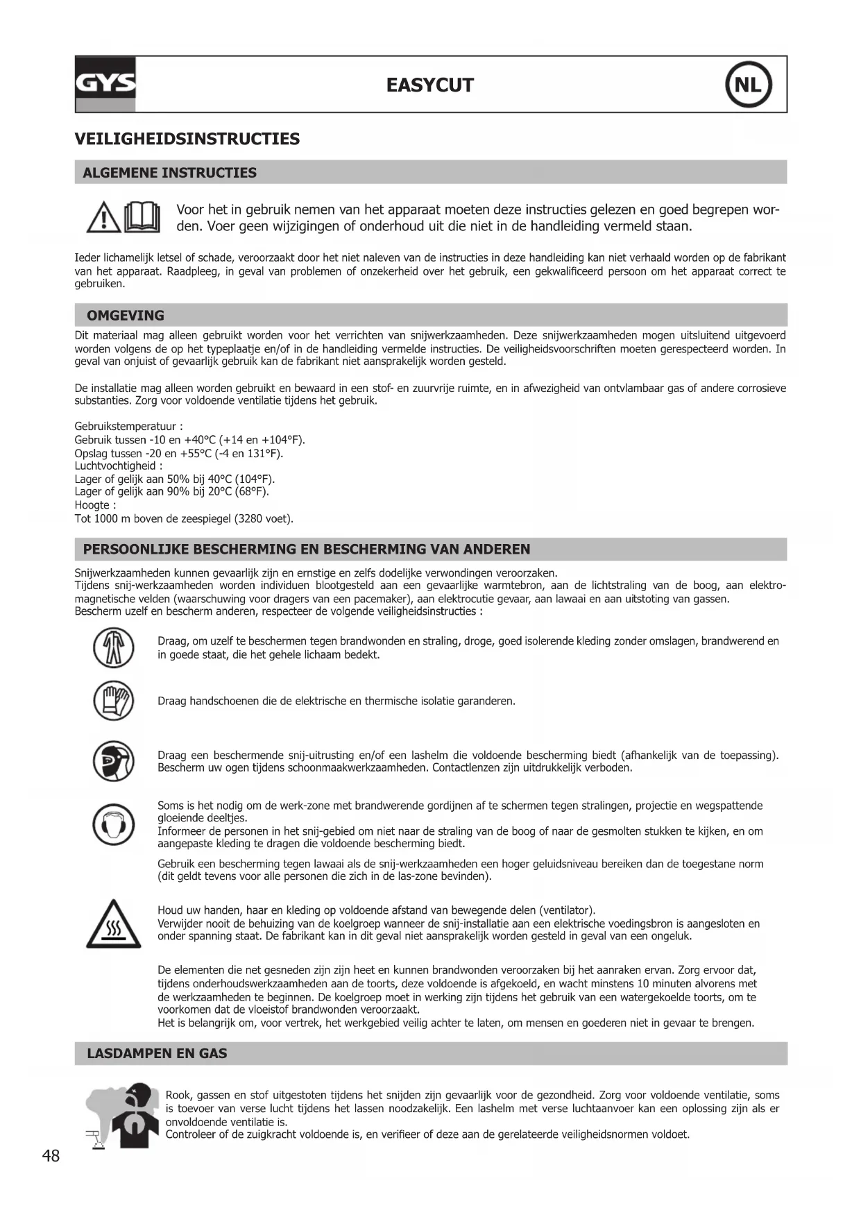 Rook, gassen en stof uitgestoten tijdens het snijden zijn gevaarlijk voor de gezondheid. Zorg voor voldoende ventilatie, soms is toevoer van verse lucht tijdens het lassen noodzakelijk. Een lashelm met verse luchtaanvoer kan een oplossing zijn als er onvoldoende ventilatie is. Controleer of de zuigkracht voldoende is, en verieer of deze aan de gerelateerde veiligheidsnormen voldoet.49 EASYCUT