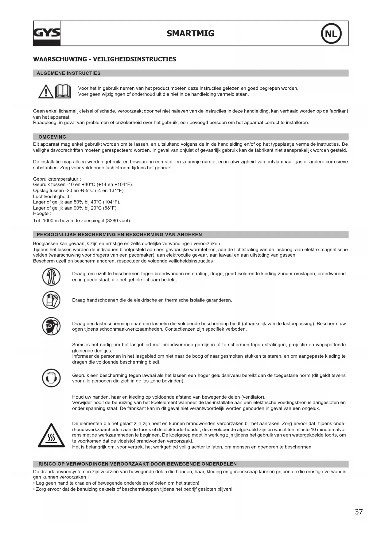 Booglassen kan gevaarlijk zijn en ernstige en zelfs dodelijke verwondingen veroorzaken. Tijdens het lassen worden de individuen blootgesteld aan een gevaarlijke warmtebron, aan de lichtstraling van de lasboog, aan elektro-magnetische velden (waarschuwing voor dragers van een pacemaker), aan elektrocutie gevaar, aan lawaai en aan uitstoting van gassen. Bescherm uzelf en bescherm anderen, respecteer de volgende veiligheidsinstructies : Draag, om uzelf te beschermen tegen brandwonden en straling, droge, goed isolerende kleding zonder omslagen, brandwerend en in goede staat, die het gehele lichaam bedekt. Draag handschoenen die de elektrische en thermische isolatie garanderen. Draag een lasbescherming en/of een lashelm die voldoende bescherming biedt (afhankelijk van de lastoepassing). Bescherm uw ogen tijdens schoonmaakwerkzaamheden. Contactlenzen zijn speciek verboden. Soms is het nodig om het lasgebied met brandwerende gordijnen af te schermen tegen stralingen, projectie en wegspattende gloeiende deeltjes. Informeer de personen in het lasgebied om niet naar de boog of naar gesmolten stukken te staren, en om aangepaste kleding te dragen die voldoende bescherming biedt. Gebruik een bescherming tegen lawaai als het lassen een hoger geluidsniveau bereikt dan de toegestane norm (dit geldt tevens voor alle personen die zich in de las-zone bevinden). Houd uw handen, haar en kleding op voldoende afstand van bewegende delen (ventilator). Verwijder nooit de behuizing van het koelelement wanneer de las-installatie aan een elektrische voedingsbron is aangesloten en onder spanning staat. De fabrikant kan in dit geval niet verantwoordelijk worden gehouden in geval van een ongeluk. De elementen die net gelast zijn zijn heet en kunnen brandwonden veroorzaken bij het aanraken. Zorg ervoor dat, tijdens onde- rhoudswerkzaamheden aan de toorts of de elektrode-houder, deze voldoende afgekoeld zijn en wacht ten minste 10 minuten alvo- rens met de werkzaamheden te beginnen. De koelgroep moet in werking zijn tijdens het gebruik van een watergekoelde toorts, om te voorkomen dat de vloeistof brandwonden veroorzaakt. Het is belangrijk om, voor vertrek, het werkgebied veilig achter te laten, om mensen en goederen te beschermen. RISICO OP VERWONDINGEN VEROORZAAKT DOOR BEWEGENDE ONDERDELEN De draadaanvoersystemen zijn voorzien van bewegende delen die handen, haar, kleding en gereedschap kunnen grijpen en die ernstige verwondin- gen kunnen veroorzaken !
