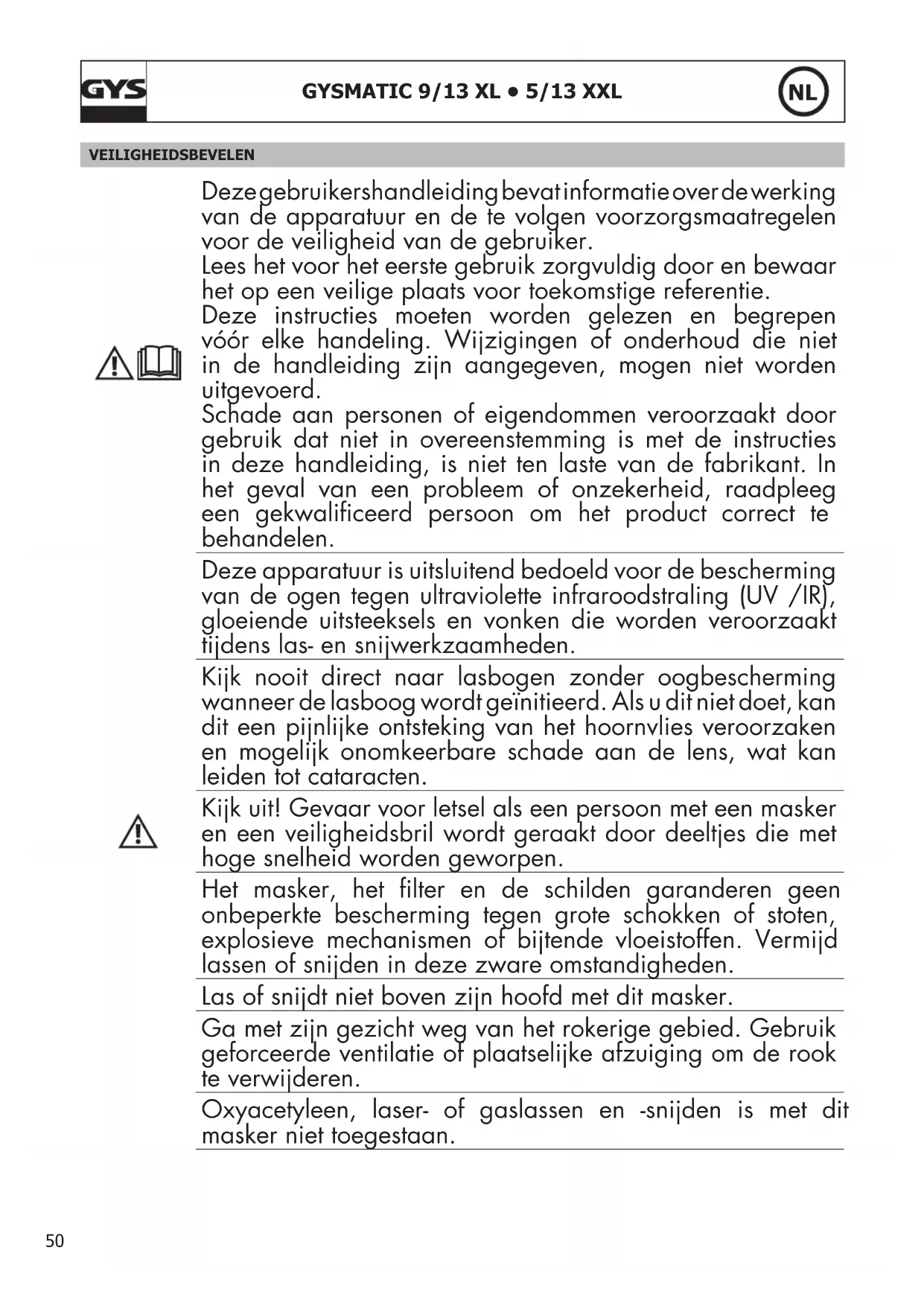 RU50 VEILIGHEIDSBEVELEN Deze gebruikershandleiding bevat informatie over de werking van de apparatuur en de te volgen voorzorgsmaatregelen voor de veiligheid van de gebruiker. Lees het voor het eerste gebruik zorgvuldig door en bewaar het op een veilige plaats voor toekomstige referentie. Deze instructies moeten worden gelezen en begrepen vóór elke handeling. Wijzigingen of onderhoud die niet in de handleiding zijn aangegeven, mogen niet worden uitgevoerd. Schade aan personen of eigendommen veroorzaakt door gebruik dat niet in overeenstemming is met de instructies in deze handleiding, is niet ten laste van de fabrikant. In het geval van een probleem of onzekerheid, raadpleeg een gekwaliceerd persoon om het product correct te behandelen. Deze apparatuur is uitsluitend bedoeld voor de bescherming van de ogen tegen ultraviolette infraroodstraling (UV /IR), gloeiende uitsteeksels en vonken die worden veroorzaakt tijdens las- en snijwerkzaamheden. Kijk nooit direct naar lasbogen zonder oogbescherming wanneer de lasboog wordt geïnitieerd. Als u dit niet doet, kan dit een pijnlijke ontsteking van het hoornvlies veroorzaken en mogelijk onomkeerbare schade aan de lens, wat kan leiden tot cataracten. Kijk uit! Gevaar voor letsel als een persoon met een masker en een veiligheidsbril wordt geraakt door deeltjes die met hoge snelheid worden geworpen. Het masker, het lter en de schilden garanderen geen onbeperkte bescherming tegen grote schokken of stoten, explosieve mechanismen of bijtende vloeistoffen. Vermijd lassen of snijden in deze zware omstandigheden. Las of snijdt niet boven zijn hoofd met dit masker. Ga met zijn gezicht weg van het rokerige gebied. Gebruik geforceerde ventilatie of plaatselijke afzuiging om de rook te verwijderen. Oxyacetyleen, laser- of gaslassen en -snijden is met dit masker niet toegestaan.