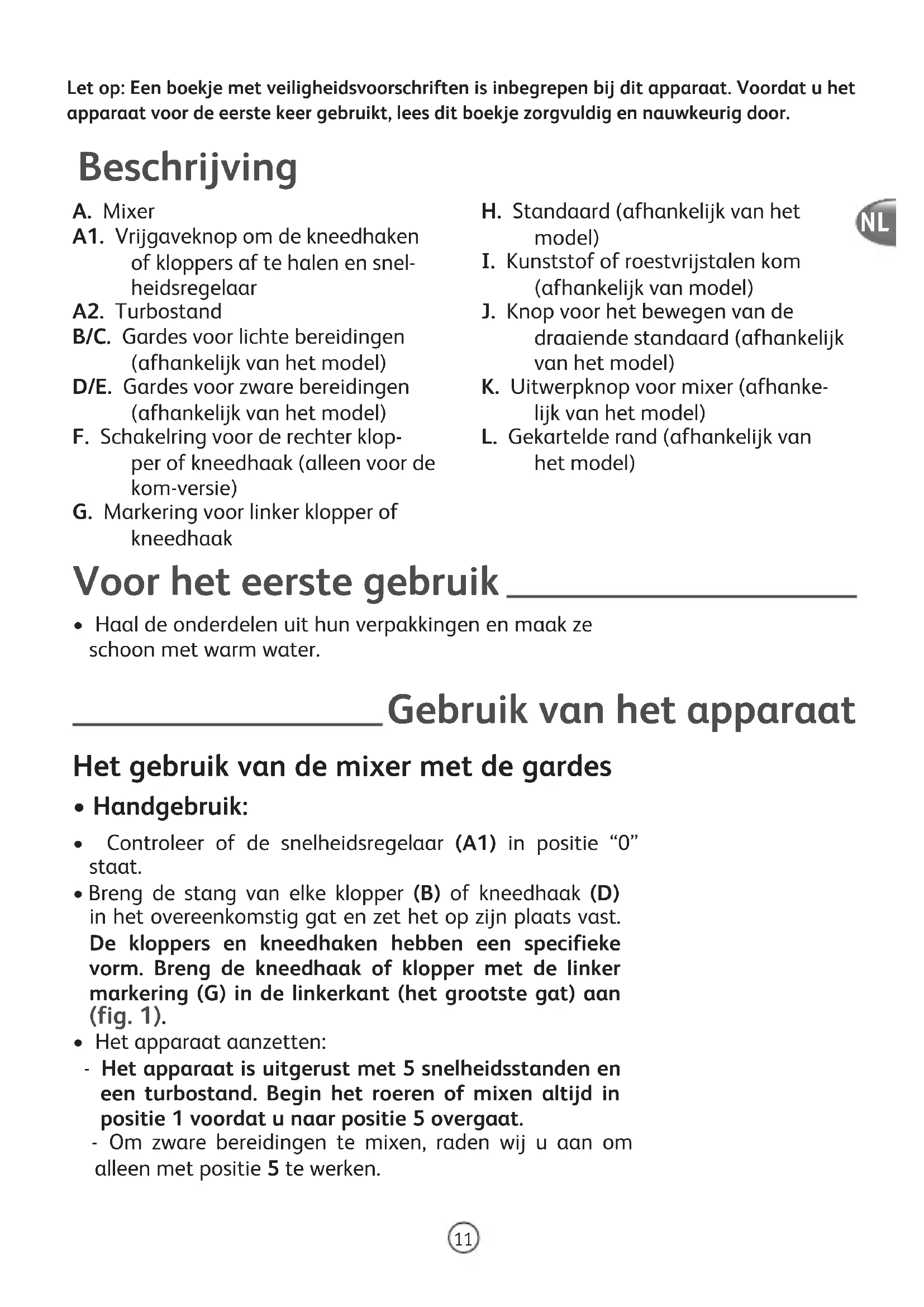 - Breng de stang van elke klopper (B) of kneedhaak (D) in het overeenkomstig gat en zet het op zijn plaats vast. De kloppers en kneedhaken hebben een specifieke vorm. Breng de kneedhaak of klopper met de linker markering (G) in de linkerkant (het grootste gat) aan (fig. 1).• Het apparaat aanzetten: - Het apparaat is uitgerust met 5 snelheidsstanden en een turbostand. Begin het roeren of mixen altijd in positie 1 voordat u naar positie 5 overgaat. - Om zware bereidingen te mixen, raden wij u aan om alleen met positie 5 te werken.Let op: Een boekje met veiligheidsvoorschriften is inbegrepen bij dit apparaat. Voordat u het apparaat voor de eerste keer gebruikt, lees dit boekje zorgvuldig en nauwkeurig door. NL12