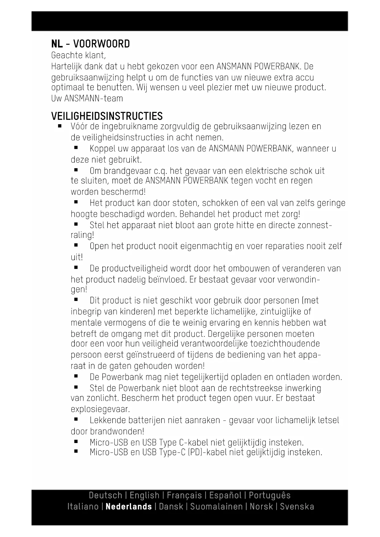 Vóór de ingebruikname zorgvuldig de gebruiksaanwijzing lezen en de veiligheidsinstructies in acht nemen. Koppel uw apparaat los van de ANSMANN POWERBANK, wanneer u deze niet gebruikt. Om brandgevaar c.q. het gevaar van een elektrische schok uit te sluiten, moet de ANSMANN POWERBANK tegen vocht en regen worden beschermd! Het product kan door stoten, schokken of een val van zelfs geringe hoogte beschadigd worden. Behandel het product met zorg! Stel het apparaat niet bloot aan grote hitte en directe zonnest- raling! Open het product nooit eigenmachtig en voer reparaties nooit zelf uit! De productveiligheid wordt door het ombouwen of veranderen van het product nadelig beïnvloed. Er bestaat gevaar voor verwondin- gen! Dit product is niet geschikt voor gebruik door personen (met inbegrip van kinderen) met beperkte lichamelijke, zintuiglijke of mentale vermogens of die te weinig ervaring en kennis hebben wat betreft de omgang met dit product. Dergelijke personen moeten door een voor hun veiligheid verantwoordelijke toezichthoudende persoon eerst geïnstrueerd of tijdens de bediening van het appa- raat in de gaten gehouden worden! De Powerbank mag niet tegelijkertijd opladen en ontladen worden. Stel de Powerbank niet bloot aan de rechtstreekse inwerking van zonlicht. Bescherm het product tegen open vuur. Er bestaat explosiegevaar. Lekkende batterijen niet aanraken - gevaar voor lichamelijk letsel door brandwonden! Micro-USB en USB Type C-kabel niet gelijktijdig insteken. Micro-USB en USB Type-C (PD)-kabel niet gelijktijdig insteken.Deutsch | English | Français | Español | Português Italiano | Nederlands | Dansk | Suomalainen | Norsk | Svenska Het niet naleven van de veiligheidsinstructies kan schade aan de POWERBANK, aan aangesloten apparaten of ernstig letsel van personen veroorzaken! Indien u vragen hebt, neem dan contact op met uw plaatselijke dealer of onze service. VOORZICHTIG EXPLOSIEGEVAAR, WANNEER DE ACCU DOOR EEN VERKEERD TYPE WORDT VERVANGEN. VOER GEBRUIKTE BATTERIJEN OVEREENKOMSTIG DE VOOR- SCHRIFTEN AF ALS AFVAL. INGEBRUIKNAME > CAPACITEITSINDICATIE Druk op de Power-toets om de resterende hoeveelheid energie te controleren. 4 LED’s branden: 75% - 100% 3 LED‘s branden: 50% - 75% 2 LED’s branden: 25% - 50% 1 LED brandt: 1% - 25% Er brandt geen LED: De POWERBANK is volledig ontladen. Laad de POWERBANK meteen op. Mocht de POWERBANK gedurende langere tijd niet gebruikt worden, dan is het noodzakelijk deze vóór de opslag op te laden, om een beschadiging van de accu te voorkomen.
