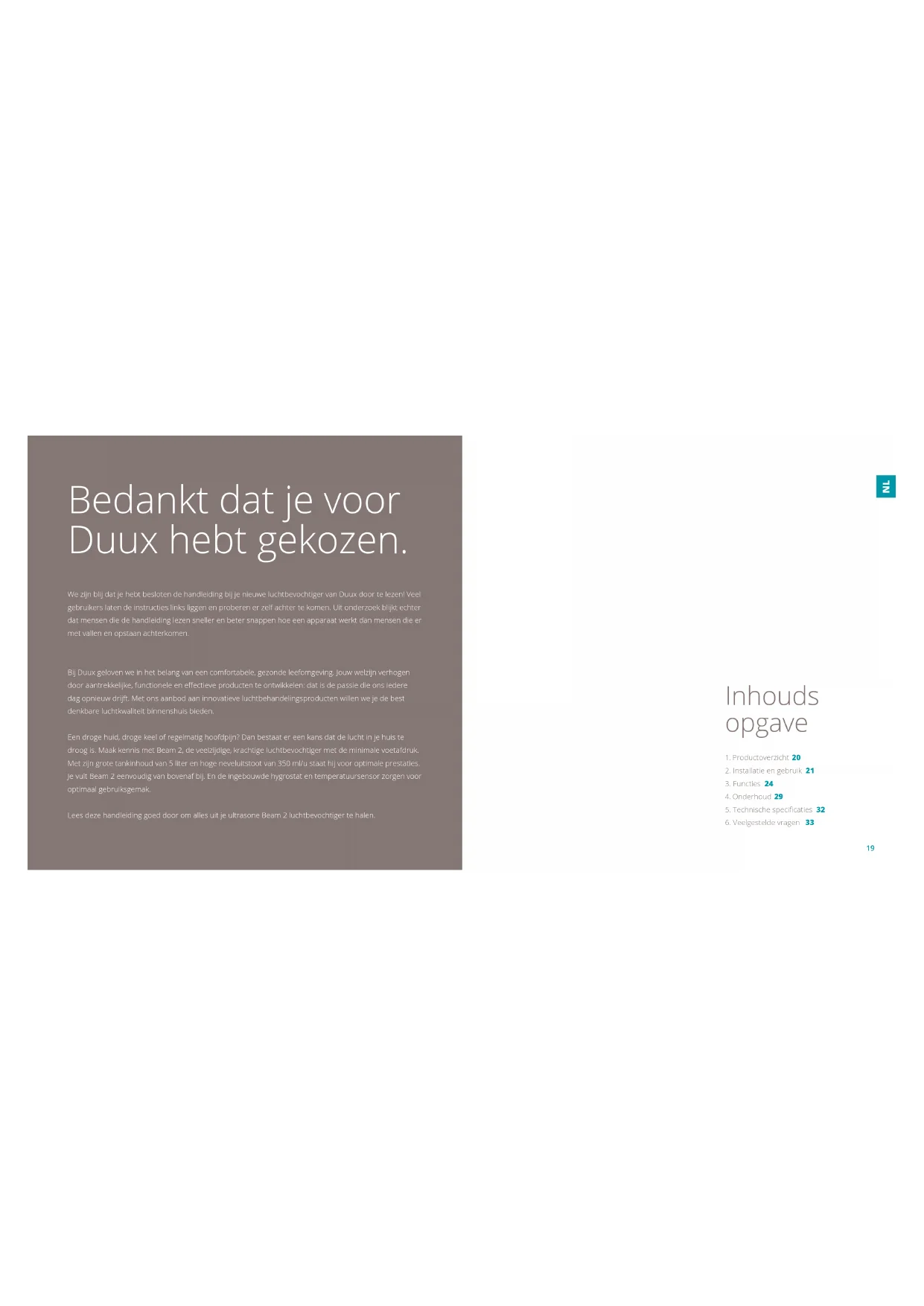 A.1918 Bedankt dat je voor Duux hebt gekozen. We zijn blij dat je hebt besloten de handleiding bij je nieuwe luchtbevochtiger van Duux door te lezen! Veel gebruikers laten de instructies links liggen en proberen er zelf achter te komen. Uit onderzoek blijkt echter dat mensen die de handleiding lezen sneller en beter snappen hoe een apparaat werkt dan mensen die er met vallen en opstaan achterkomen. Bij Duux geloven we in het belang van een comfortabele, gezonde leefomgeving. Jouw welzijn verhogen door aantrekkelijke, functionele en eectieve producten te ontwikkelen: dat is de passie die ons iedere dag opnieuw drijft. Met ons aanbod aan innovatieve luchtbehandelingsproducten willen we je de best denkbare luchtkwaliteit binnenshuis bieden. Een droge huid, droge keel of regelmatig hoofdpijn? Dan bestaat er een kans dat de lucht in je huis te droog is. Maak kennis met Beam 2, de veelzijdige, krachtige luchtbevochtiger met de minimale voetafdruk. Met zijn grote tankinhoud van 5 liter en hoge neveluitstoot van 350 ml/u staat hij voor optimale prestaties. Je vult Beam 2 eenvoudig van bovenaf bij. En de ingebouwde hygrostat en temperatuursensor zorgen voor optimaal gebruiksgemak. Lees deze handleiding goed door om alles uit je ultrasone Beam 2 luchtbevochtiger te halen.