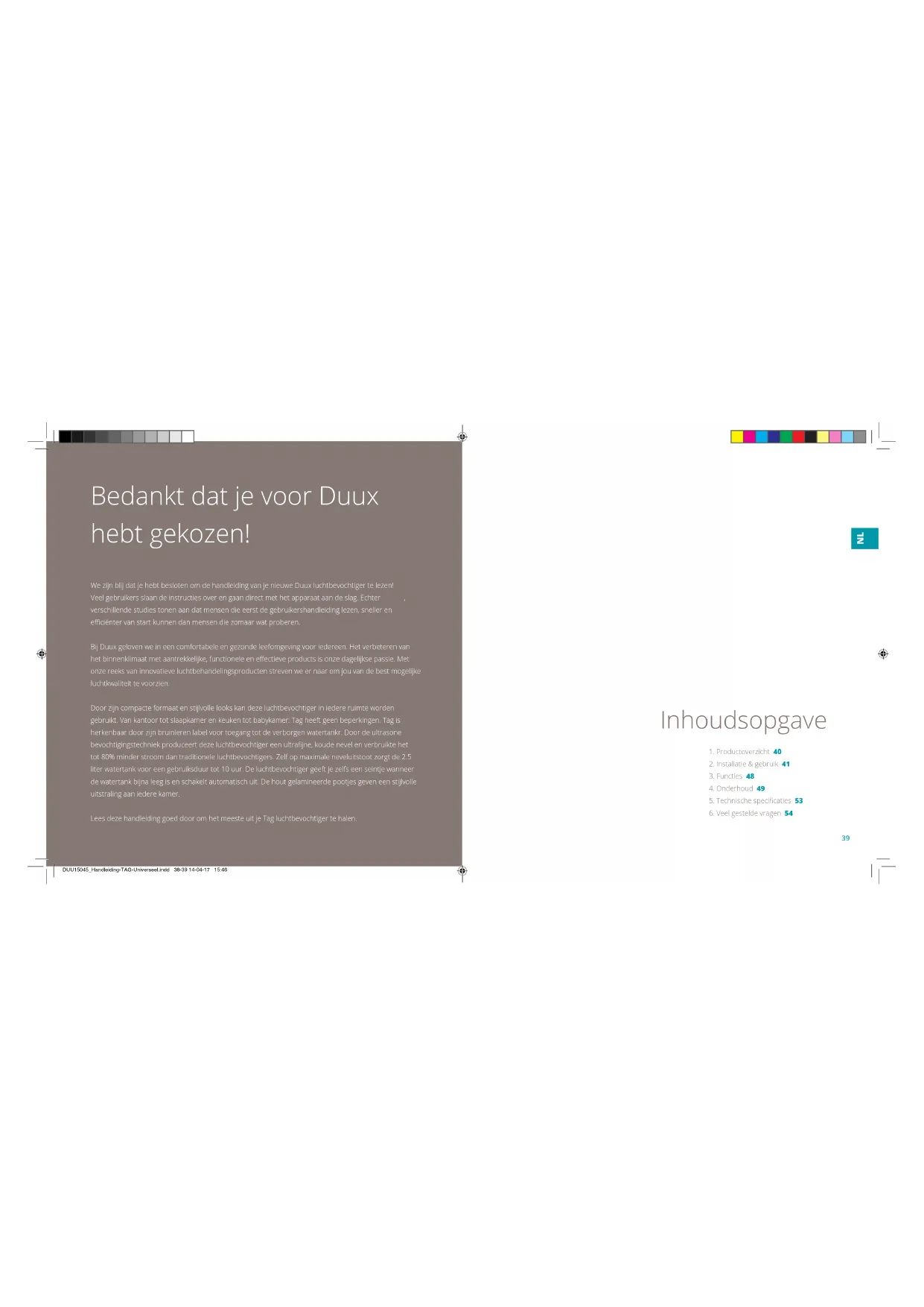 DUU15045_Handleiding-TAG-Universeel.indd 36-37 14-04-17 15:463938 Bedankt dat je voor Duux hebt gekozen! We zijn blij dat je hebt besloten om de handleiding van je nieuwe Duux luchtbevochtiger te lezen! Veel gebruikers slaan de instructies over en gaan direct met het apparaat aan de slag. Echter , verschillende studies tonen aan dat mensen die eerst de gebruikershandleiding lezen, sneller en eciënter van start kunnen dan mensen die zomaar wat proberen. Bij Duux geloven we in een comfortabele en gezonde leefomgeving voor iedereen. Het verbeteren van het binnenklimaat met aantrekkelijke, functionele en eectieve products is onze dagelijkse passie. Met onze reeks van innovatieve luchtbehandelingsproducten streven we er naar om jou van de best mogelijke luchtkwaliteit te voorzien. Door zijn compacte formaat en stijlvolle looks kan deze luchtbevochtiger in iedere ruimte worden gebruikt. Van kantoor tot slaapkamer en keuken tot babykamer: Tag heeft geen beperkingen. Tag is herkenbaar door zijn bruinleren label voor toegang tot de verborgen watertankr. Door de ultrasone bevochtigingstechniek produceert deze luchtbevochtiger een ultrajne, koude nevel en verbruikte het tot 80% minder stroom dan traditionele luchtbevochtigers. Zelf op maximale neveluitstoot zorgt de 2.5 liter watertank voor een gebruiksduur tot 10 uur. De luchtbevochtiger geeft je zelfs een seintje wanneer de watertank bijna leeg is en schakelt automatisch uit. De hout gelamineerde pootjes geven een stijlvolle uitstraling aan iedere kamer. Lees deze handleiding goed door om het meeste uit je Tag luchtbevochtiger te halen.