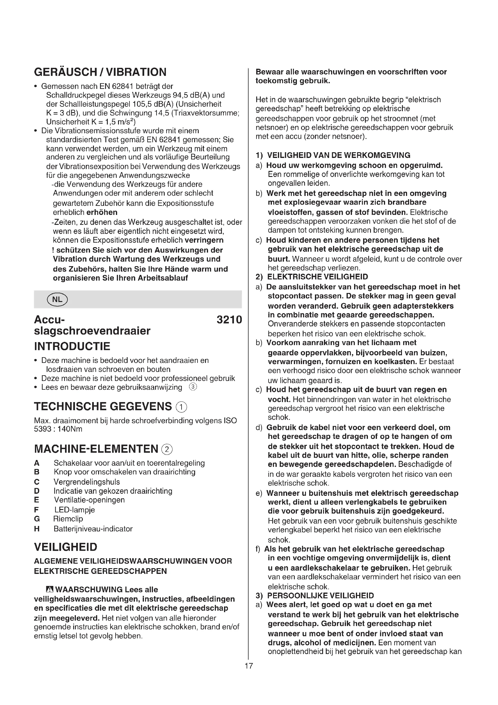 a) Laat het gereedschap alleen repareren door gekwaliceerd en vakkundig personeel en alleen met originele vervangingsonderdelen. Daarmee wordt gewaarborgd dat de veiligheid van het gereedschap in stand blijft. b) Voer nooit servicewerkzaamheden aan beschadigde accu’s uit. Service van accu’s dient uitsluitend te worden uitgevoerd door de fabrikant of erkende servicewerkplaatsen. VEILIGHEIDSVOORSCHRIFTEN VOOR ACCU-SLAGSCHROEVENDRAAIERS