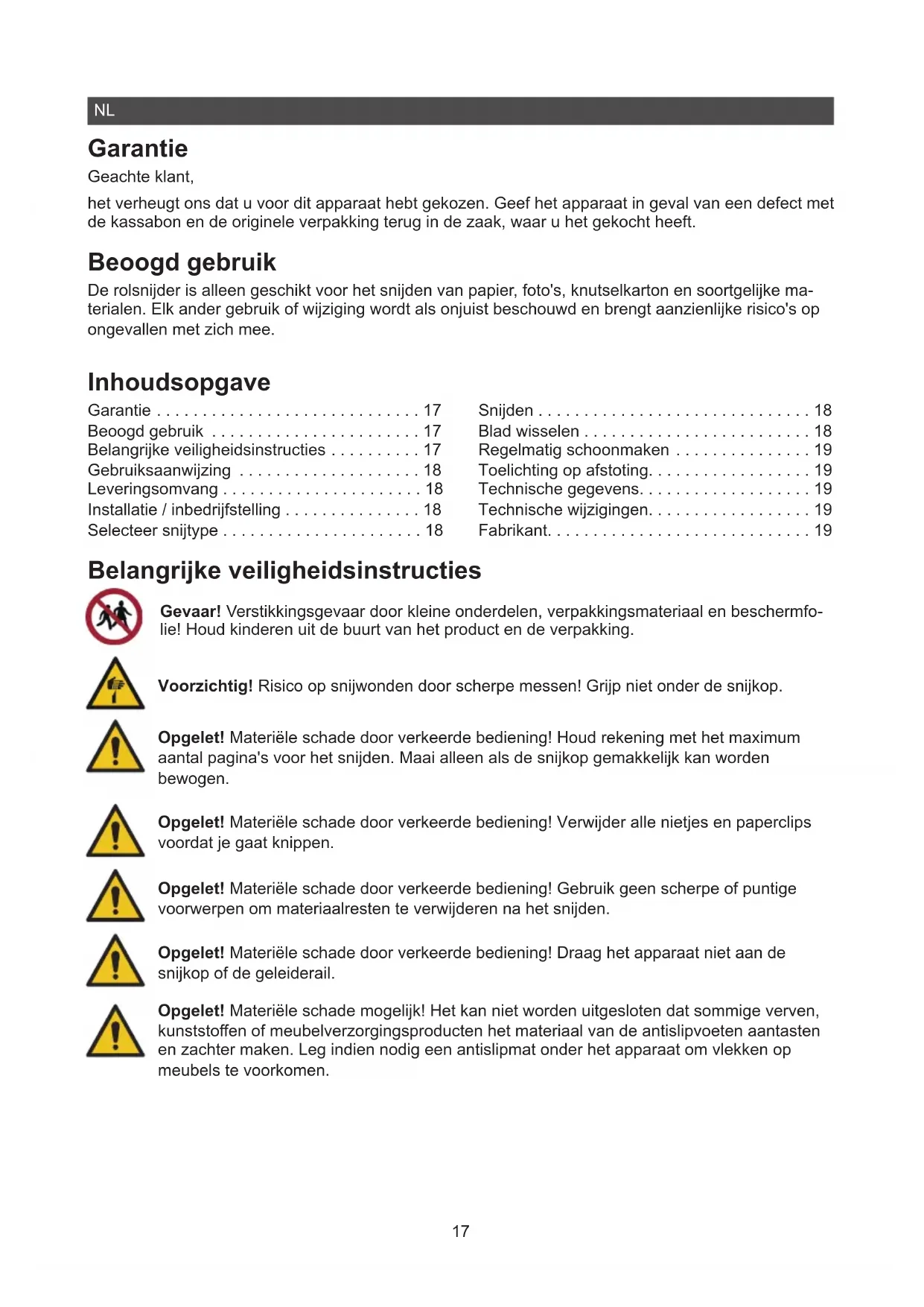 - Garantie Geachte klant, het verheugt ons dat u voor dit apparaat hebt gekozen. Geef het apparaat in geval van een defect met de kassabon en de originele verpakking terug in de zaak, waar u het gekocht heeft. Beoogd gebruik De rolsnijder is alleen geschikt voor het snijden van papier, foto's, knutselkarton en soortgelijke ma- terialen. Elk ander gebruik of wijziging wordt als onjuist beschouwd en brengt aanzienlijke risico's op ongevallen met zich mee. Inhoudsopgave Garantie p. 17